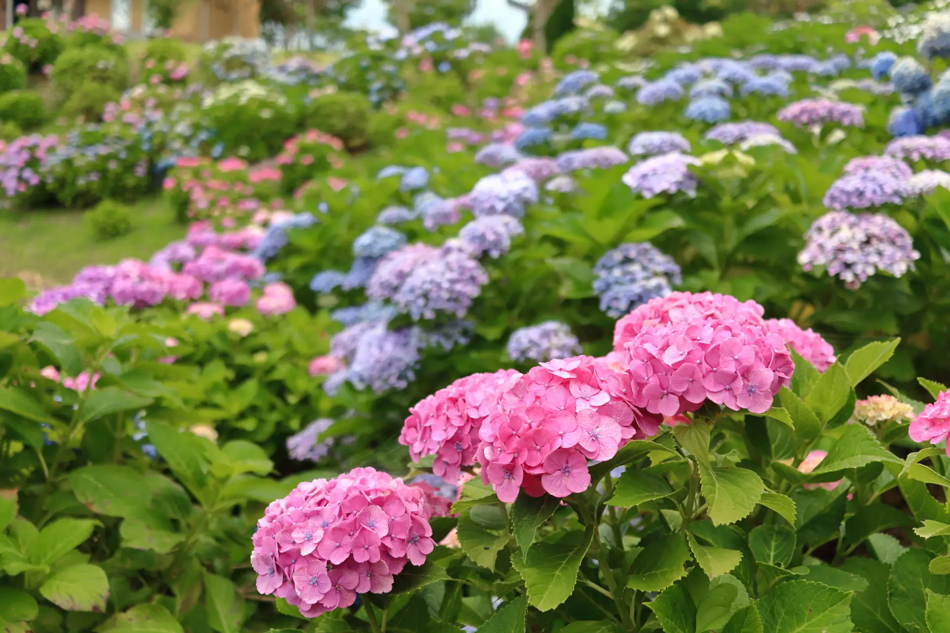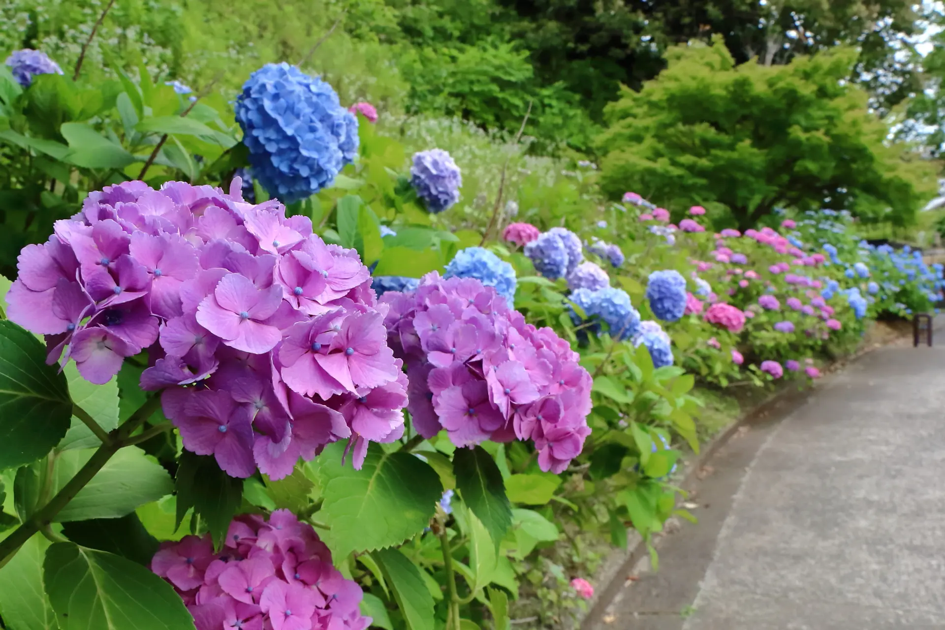 園路を進むと両側に紫陽花が植えられていて、ピンク~紫~青色など色彩鮮やかな景色が広がります。
