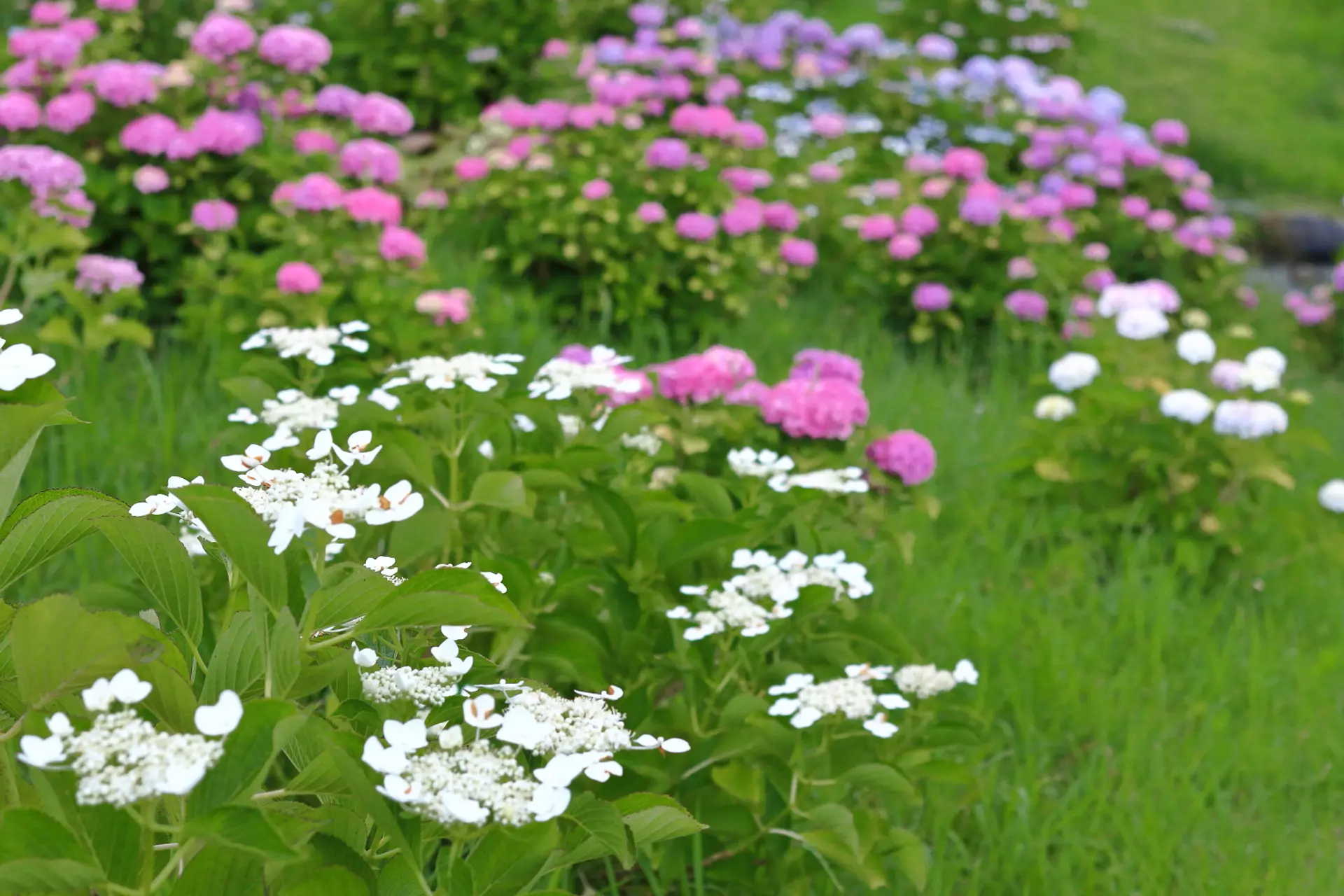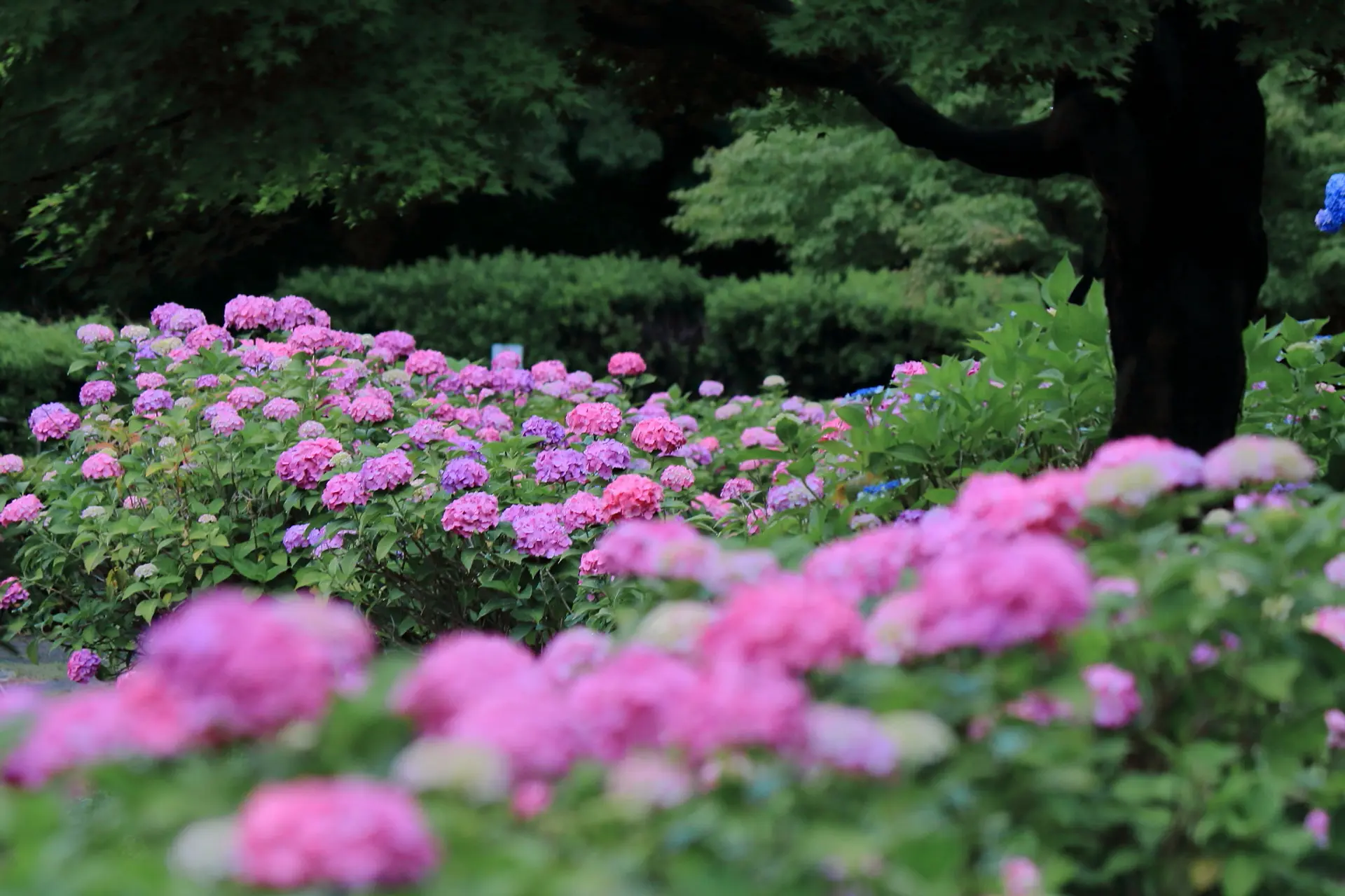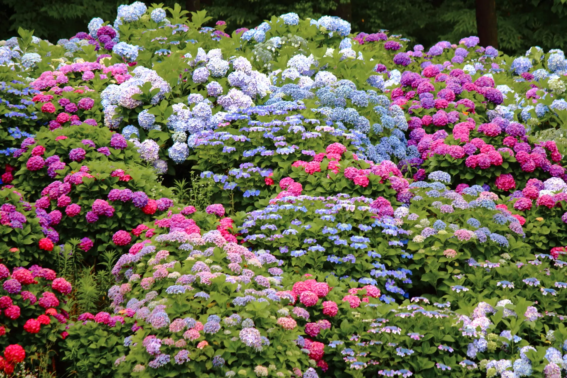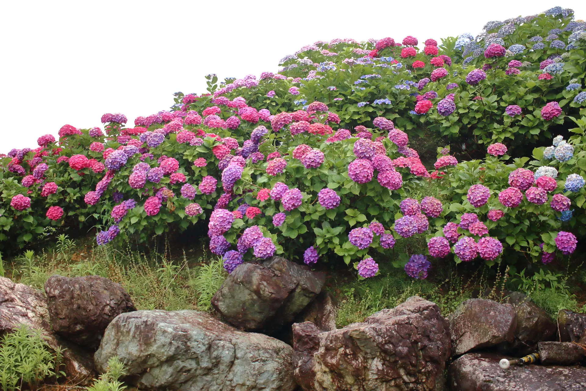 白~ピンク~赤~青~紫の色鮮やかな紫陽花の密度も濃くて見応えあります。