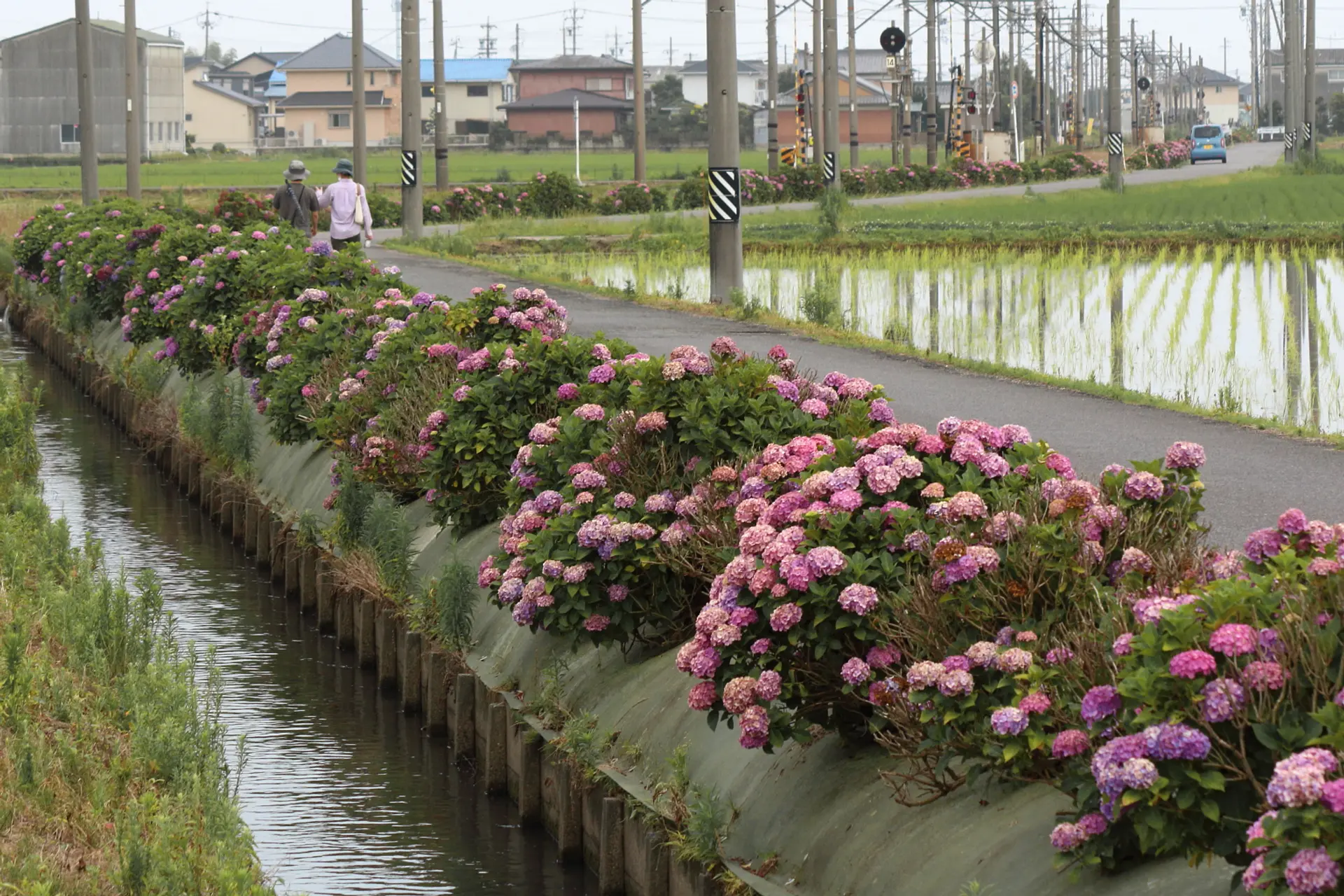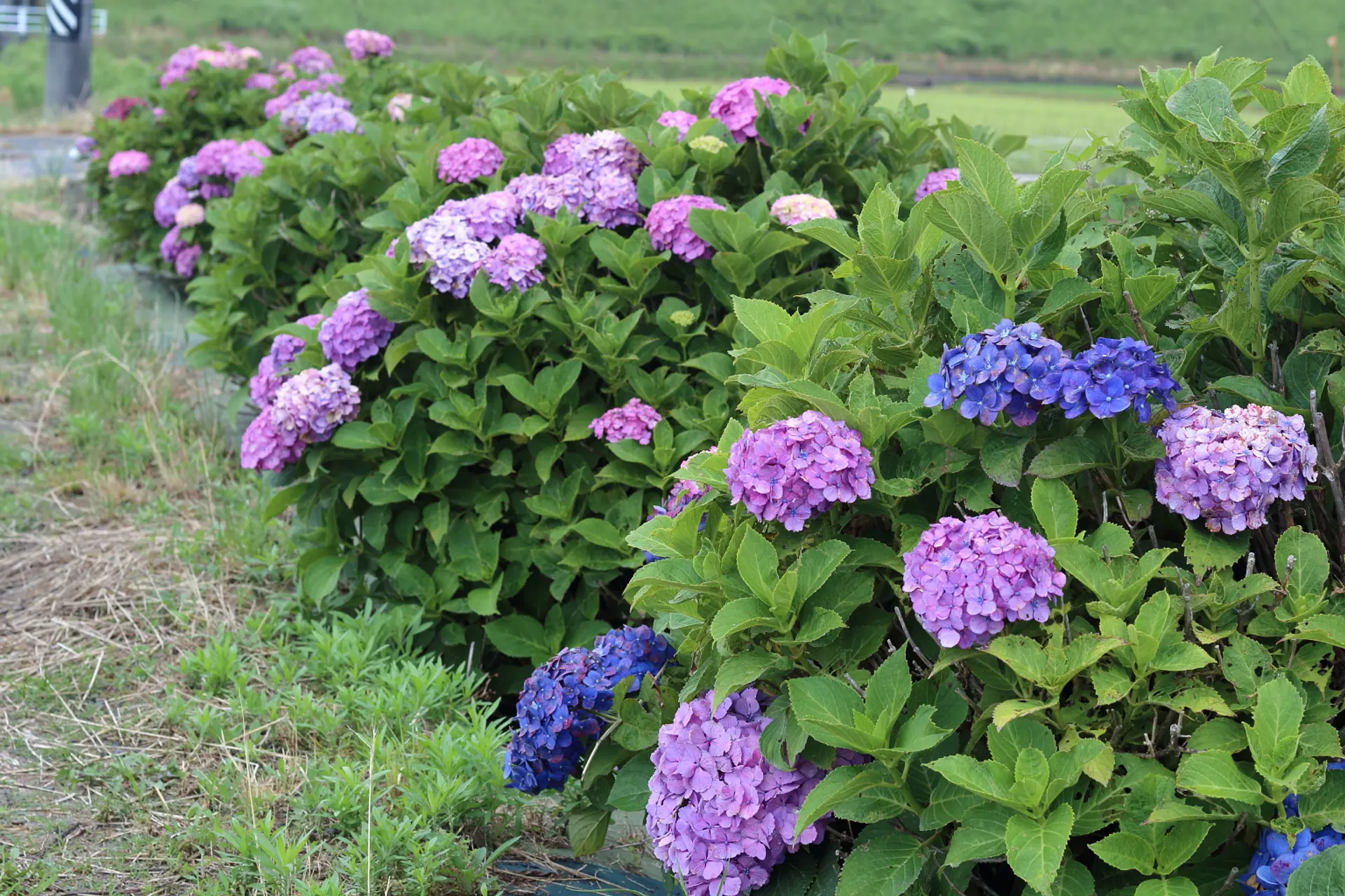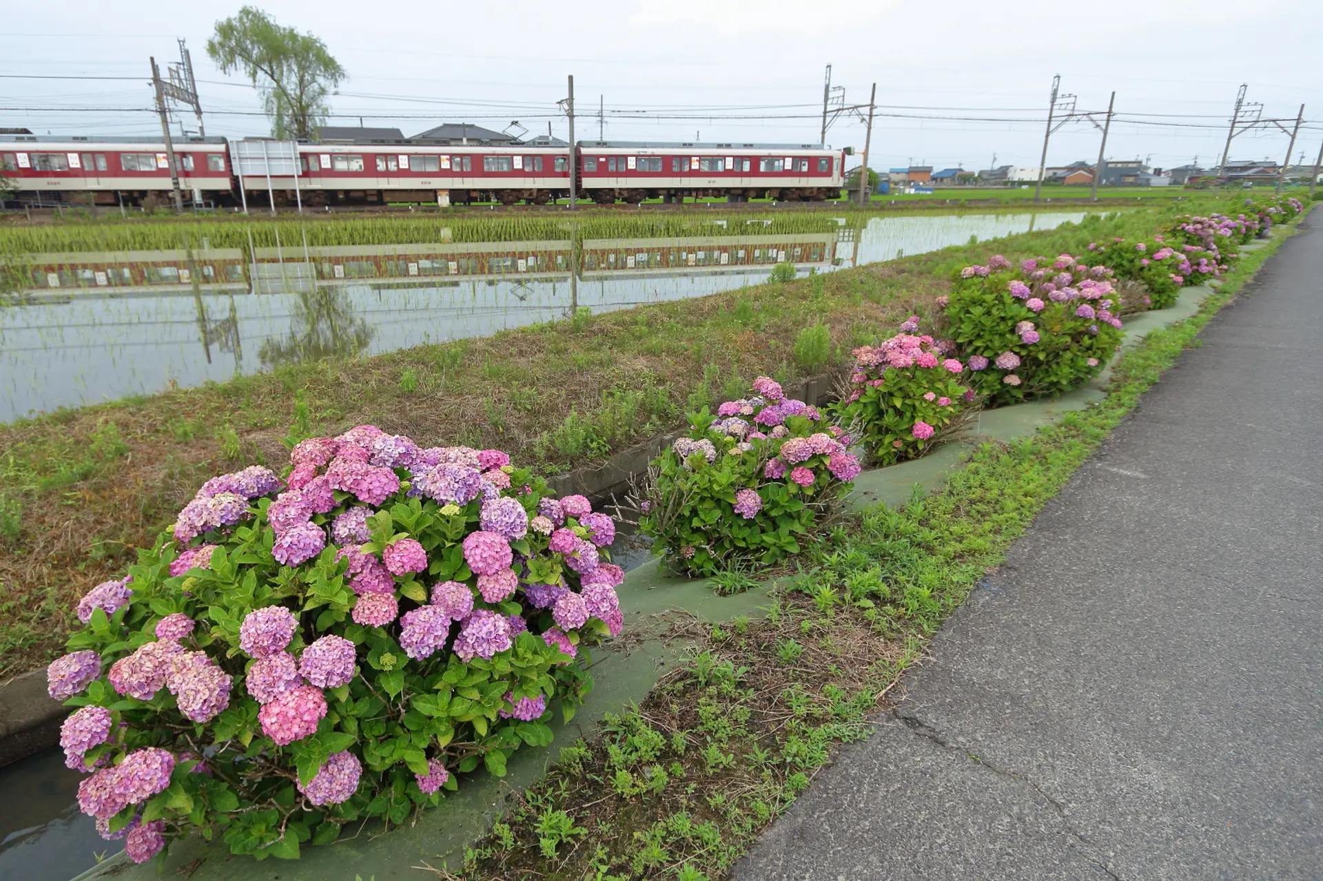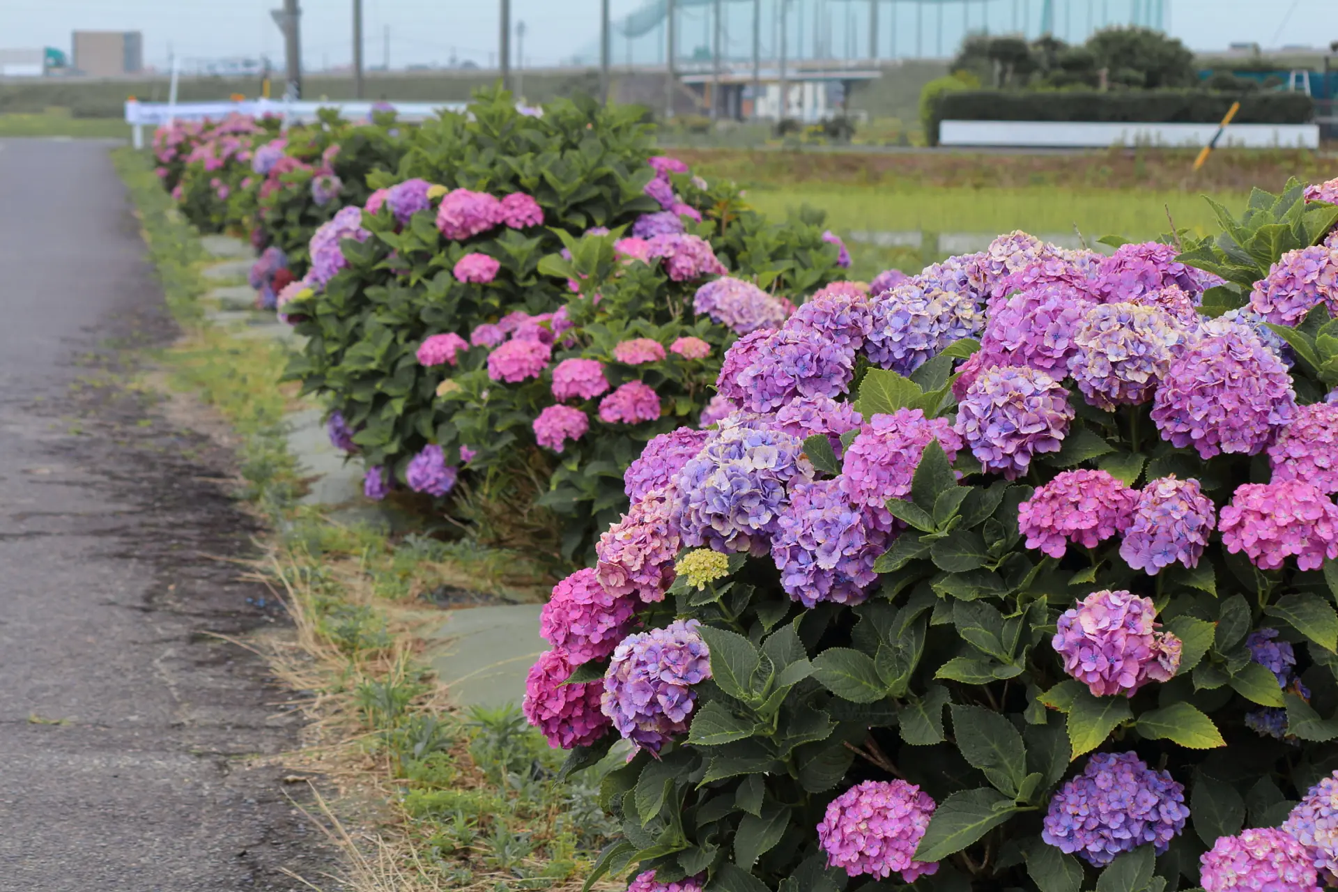 近鉄の線路沿い並行して続くこのあじさいロード、当初は約200mだったとのことですが、「玉垣・農地・水・環境を守る会」をはじめとする地元の方々の尽力によって今では約2kmも続く、見どころのある紫陽花スポットとなっています。