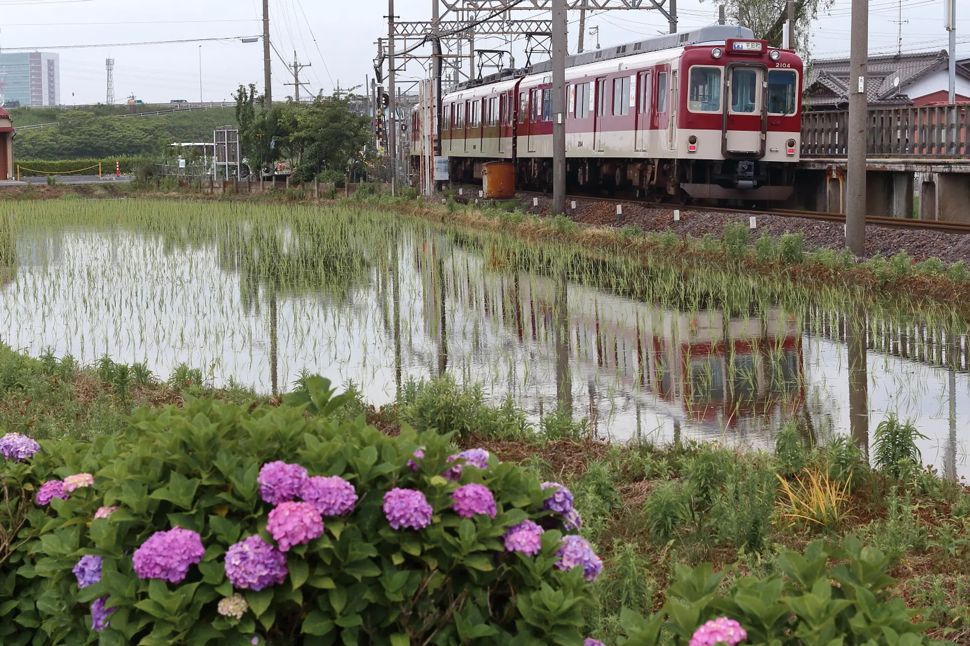 カメラを持っている方は、電車が通る時は水田に映る電車とのコラボレーションがシャッターチャンスで見逃せません。