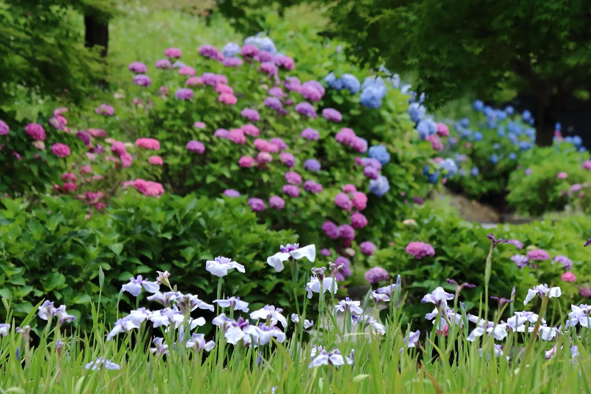 ちょっと離れたところから、花菖蒲と紫陽花がたくさん映るように眺めたりと、お気に入り景色を探してみると面白いと思います。
