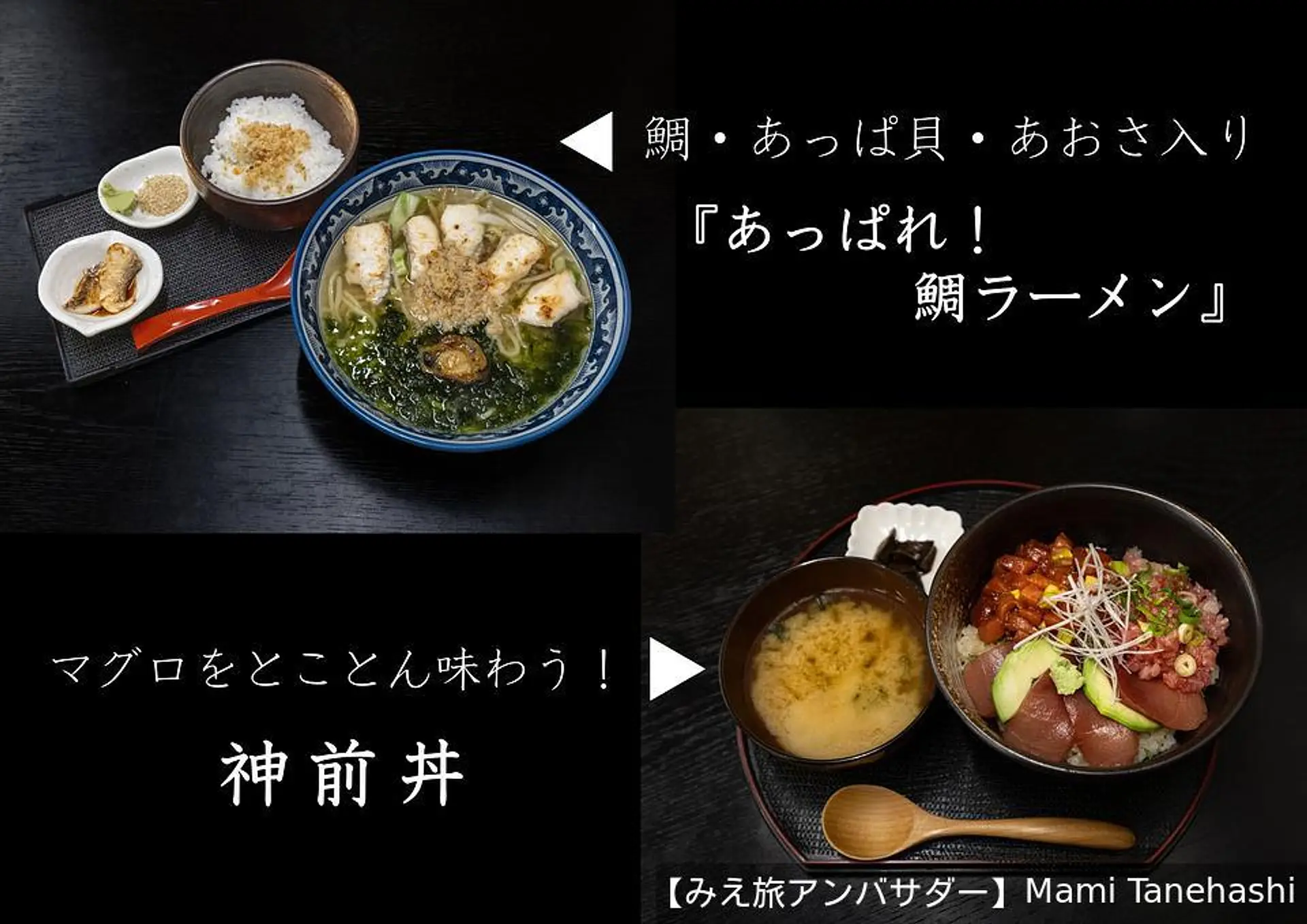 美味しいメニューがたくさんありますが、特にオススメなのは南伊勢の海の幸が味わえる『 あっぱれ!鯛ラーメン 』『 神前丼 』です。