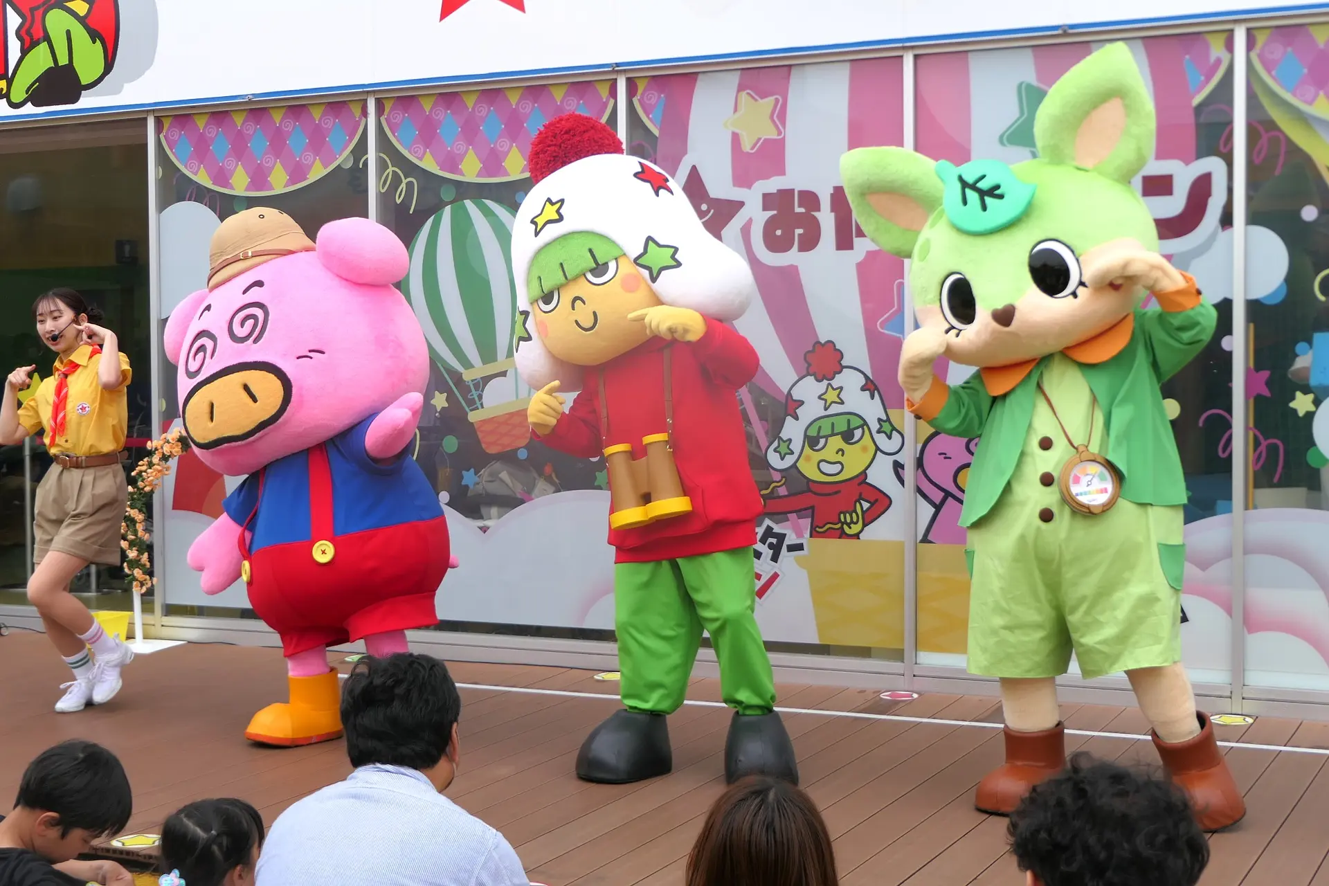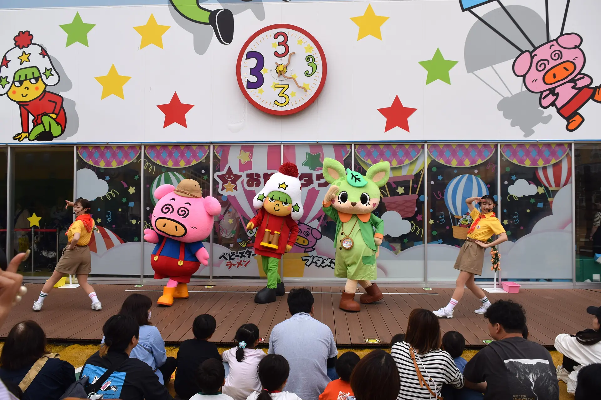 2025年4月24日にリニューアルした大人気キャラクターショー「ハッピーモーメント」。おやつタウンの建物の前で行われます。