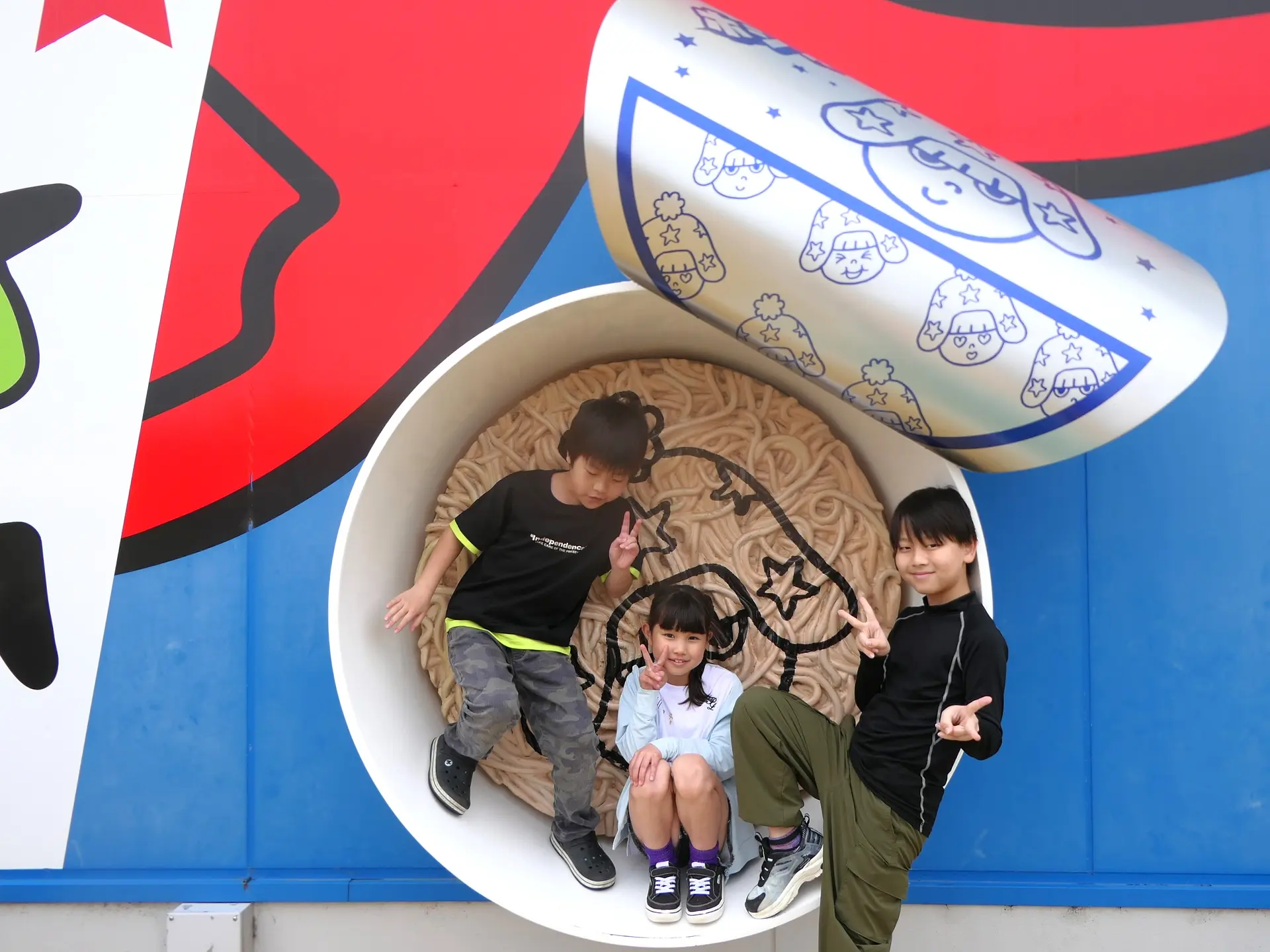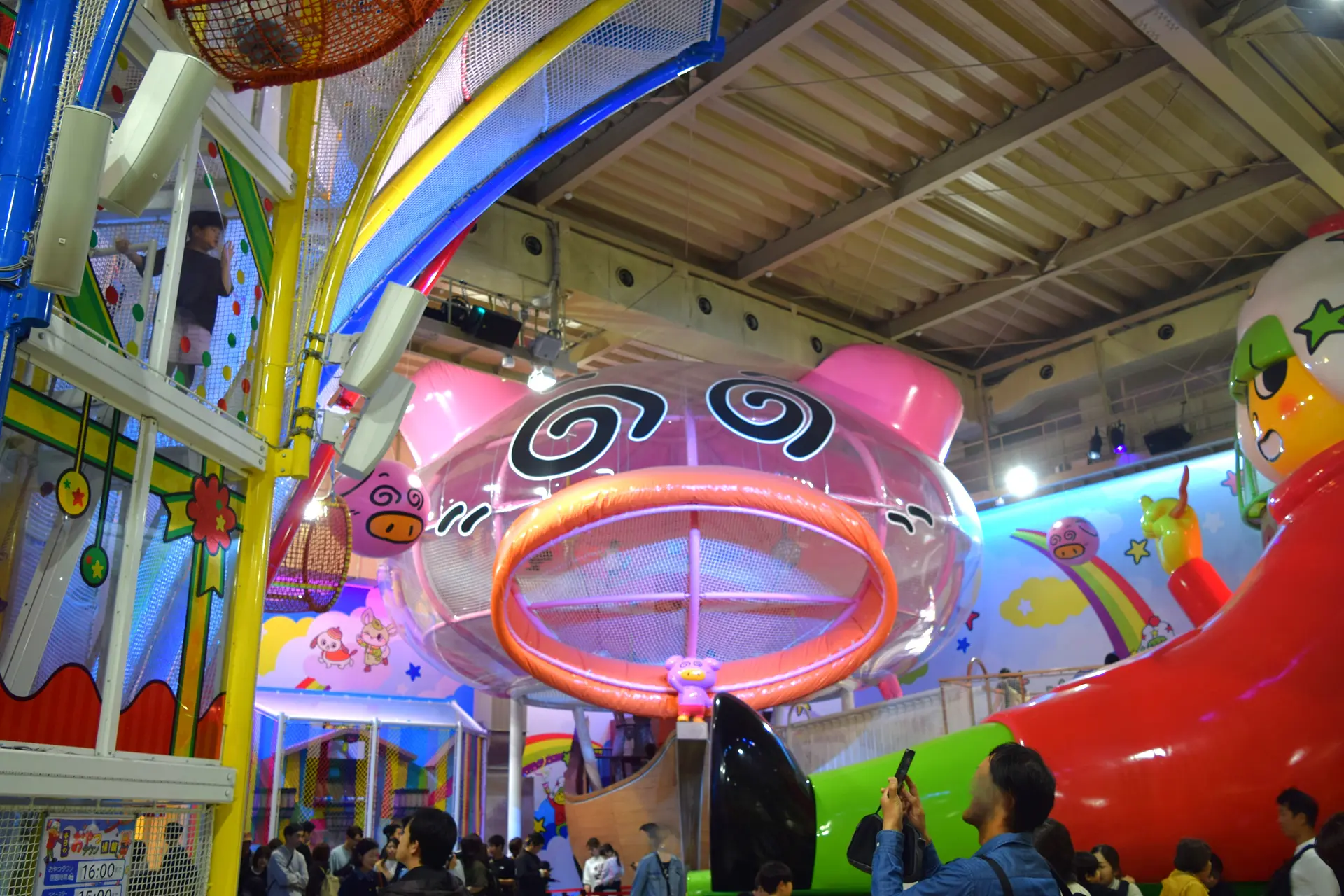 ブタメンくんのドデカいピンク色の顔が特徴のこの新アトラクションは、2025年3月19日に誕生しました。高さ9メートル、幅10メートルという屋内空間立体型遊具では日本最大級のスケールです。