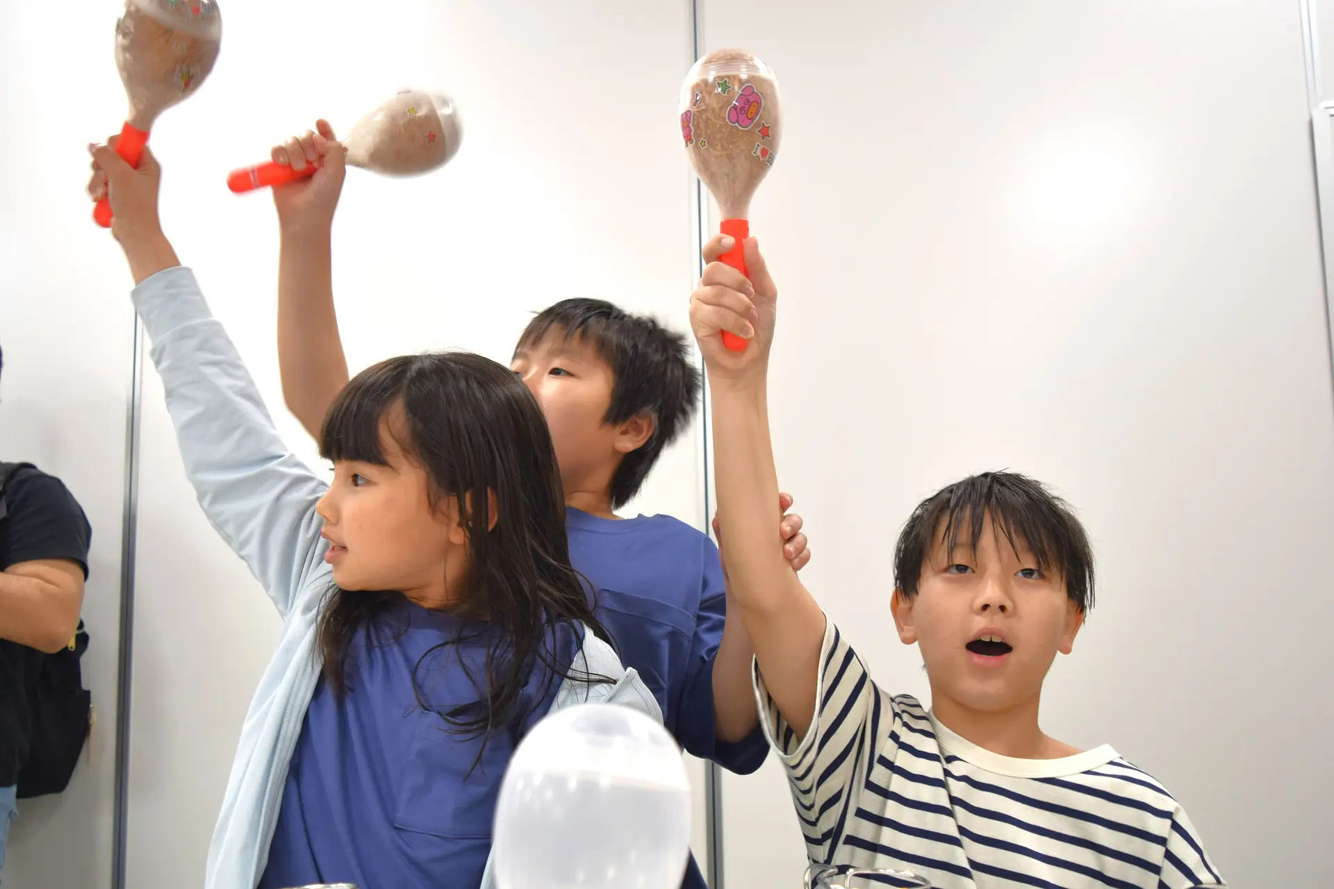 ベビースターラーメンのキャラクター「ホシオくん」、「ブタメンくん」、おやつタウンのキャラクター「ハーリー」が登場すると、会場から拍手が沸き起こりました!
