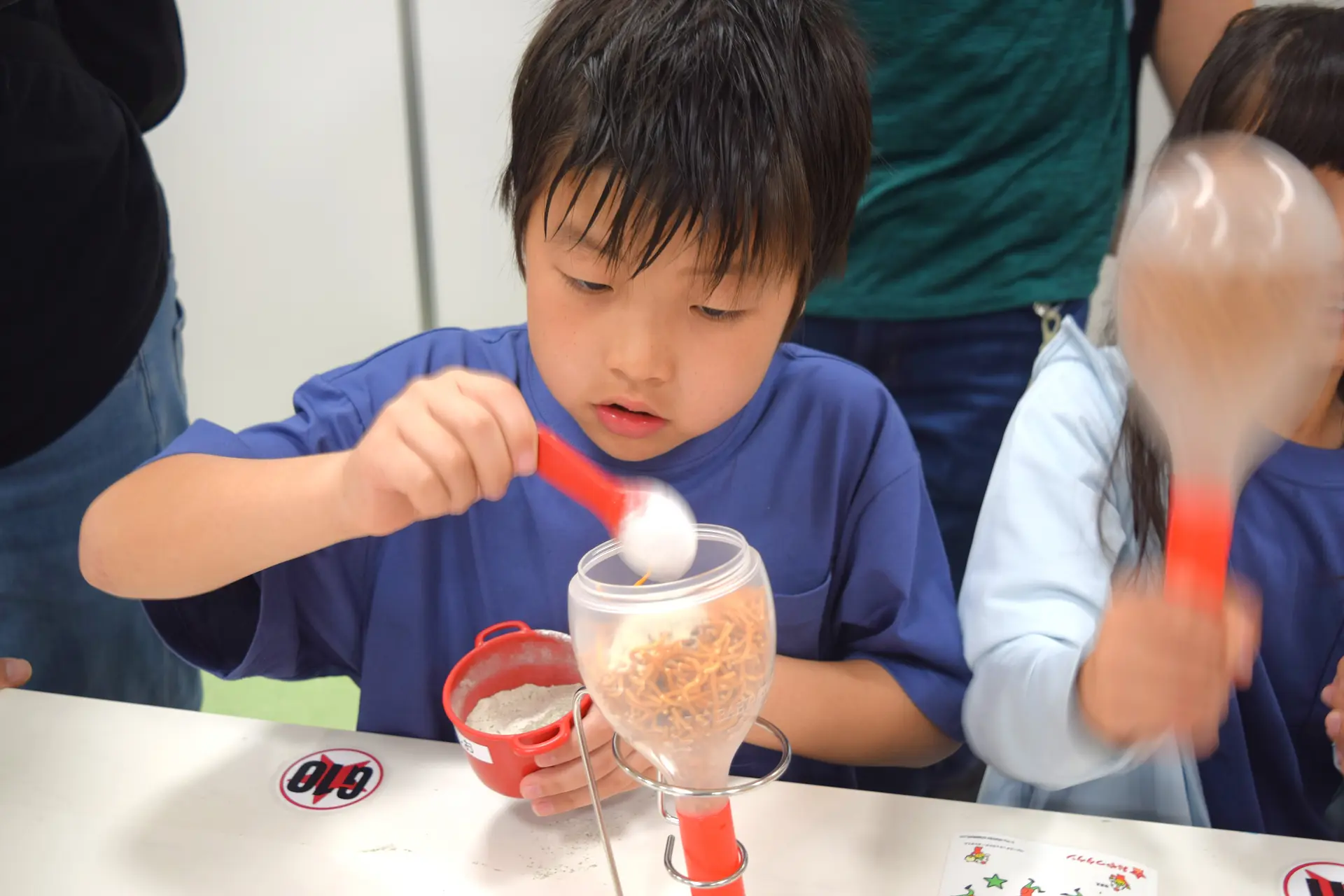 つくる体験には、「My スペシャルベビースター」「作ろう!チョコクランチ」などがありますが、今回3人が体験したのは「フリフリ♪ベビースター」です。