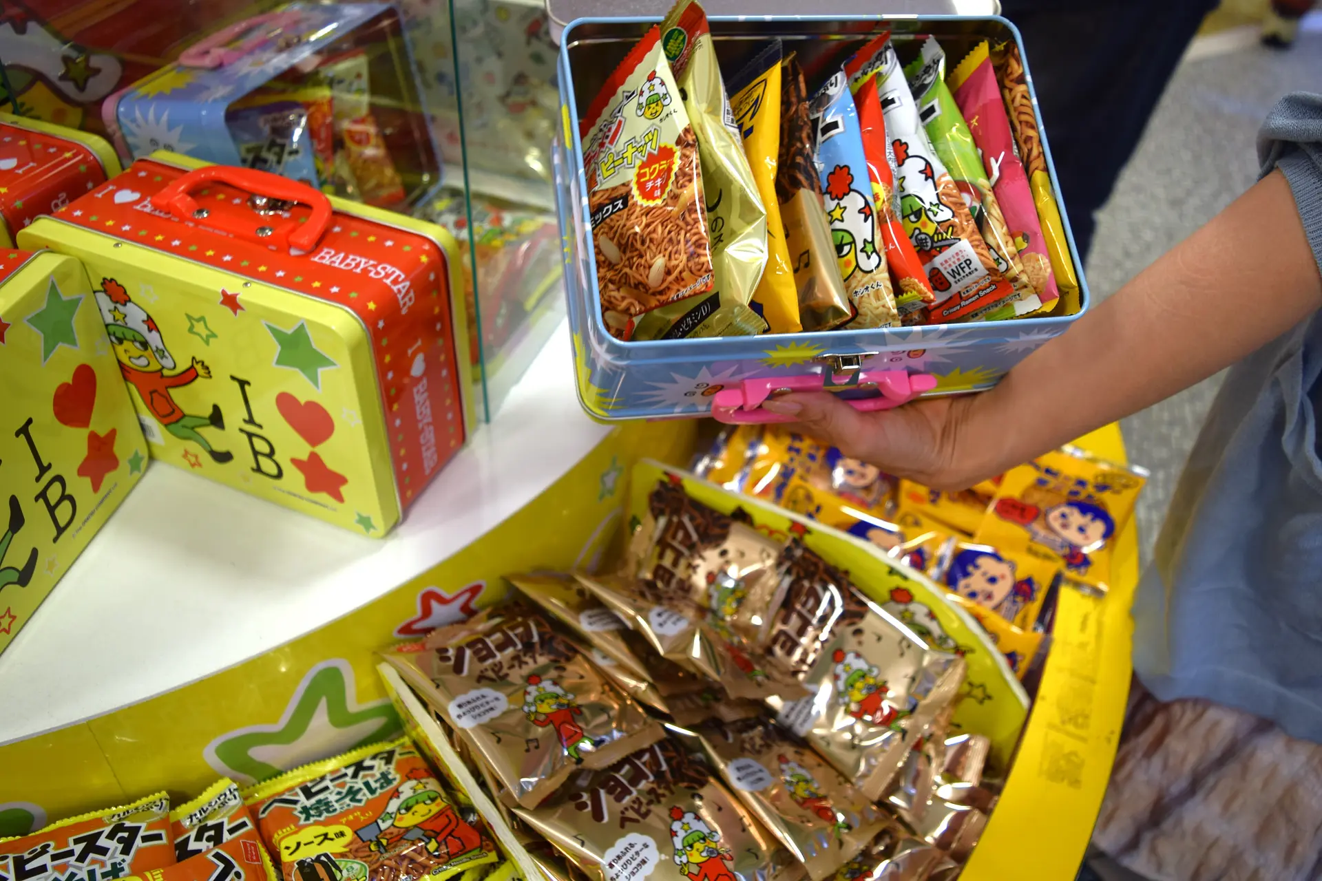最後は、バイキング形式で色んな味のベビースターラーメンが選べる「おやつタウンバイキング」。缶のケースを選び、10種類のベビースターラーメンを詰めていきます。