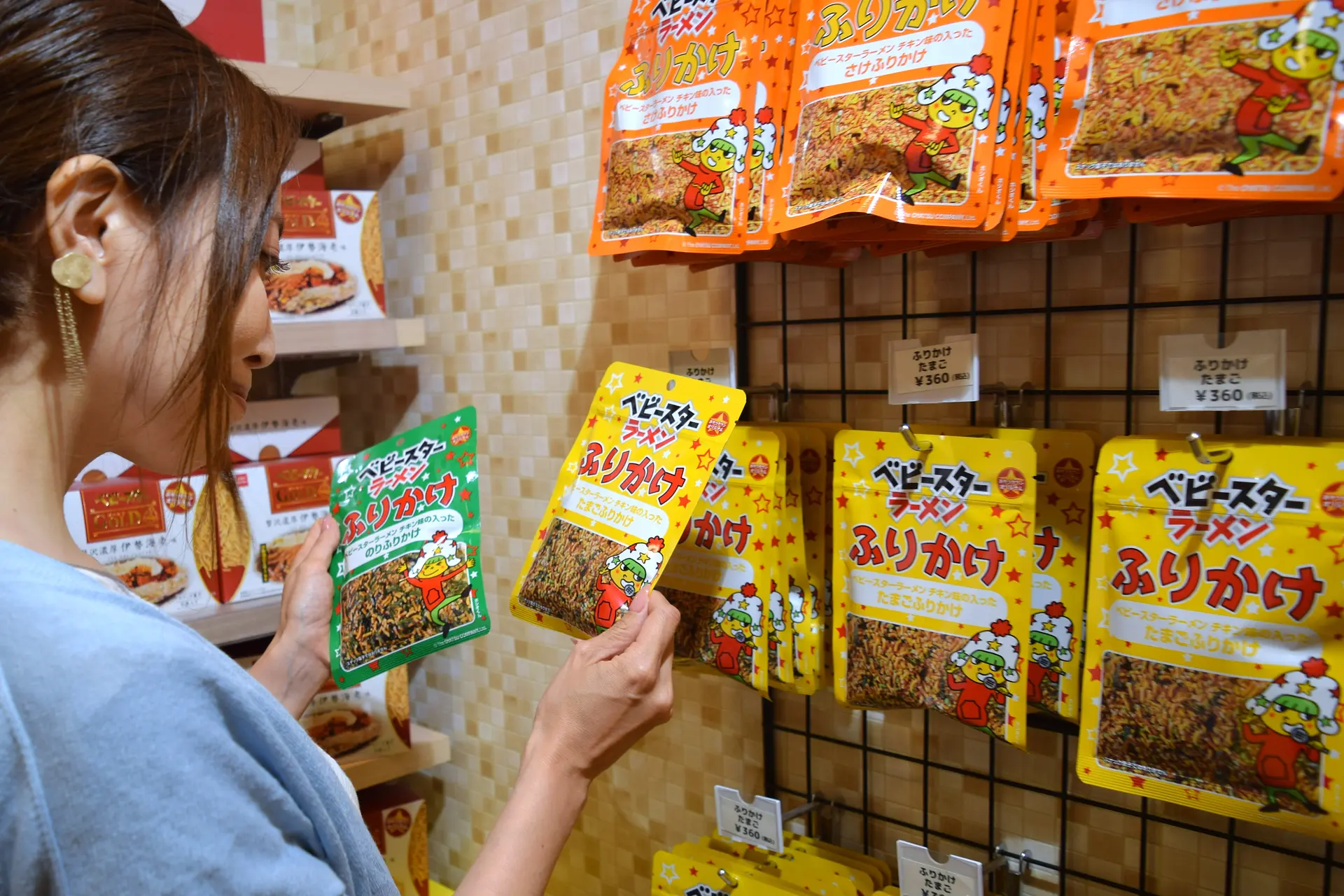 ベビースターラーメンはご飯にも合う?!意外な人気商品が、ベビースターラーメンのチキン味が入ったふりかけシリーズです。たまご、のり、さけ、たらこの4種類が並んでいます。お弁当にも使えそうですね。