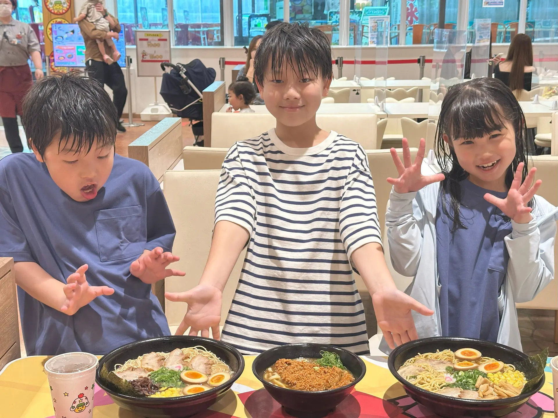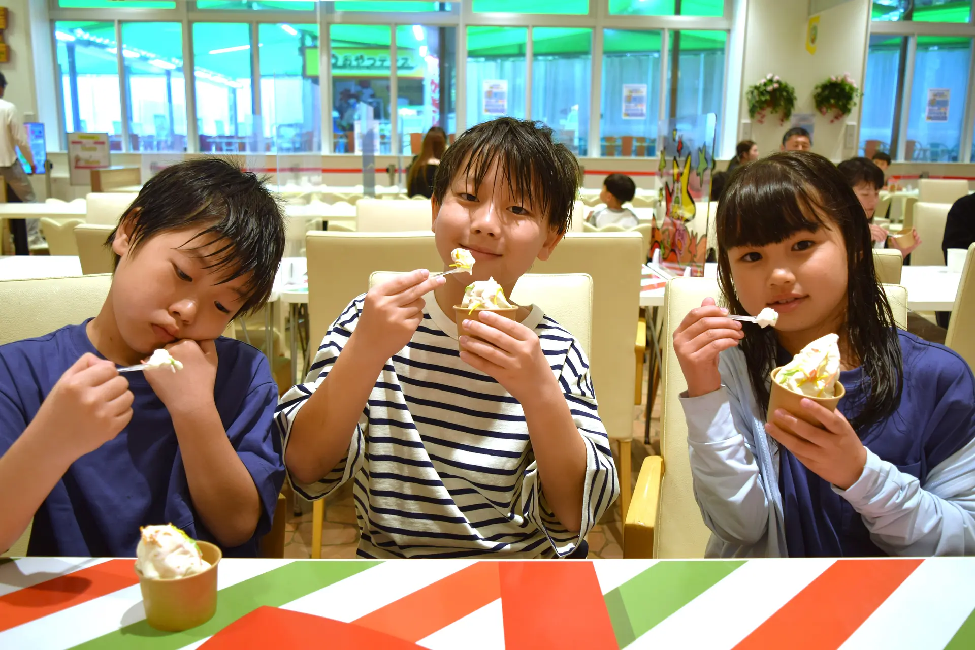 この日体験しに来てくれたのは、三重県内に住む小学生、右からミナトくん、リオちゃん、リョウマくんです。普段からおやつにベビースターラーメンやブタメンを食べているという3人、新しくなった「おやつタウン」へいざ出陣!