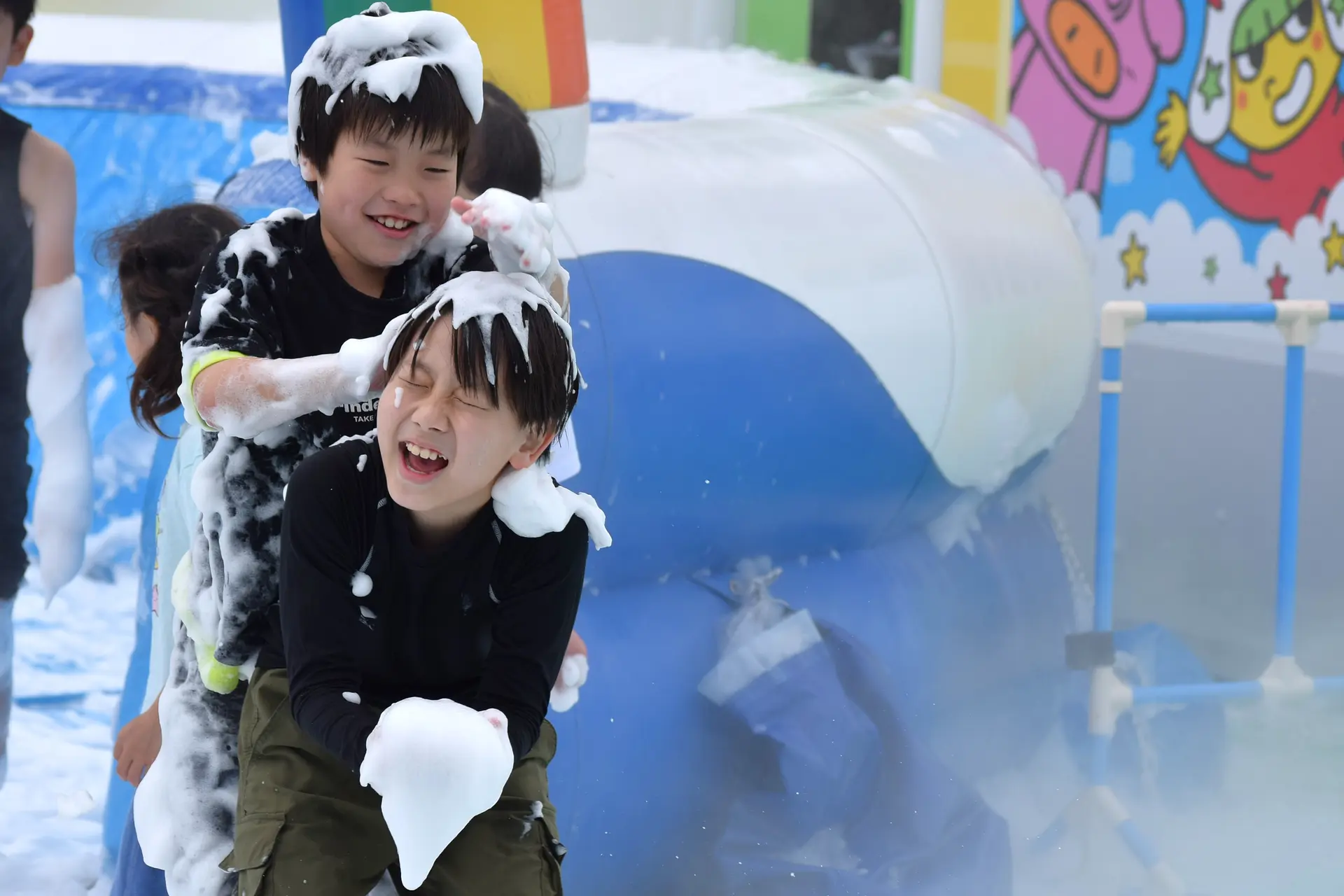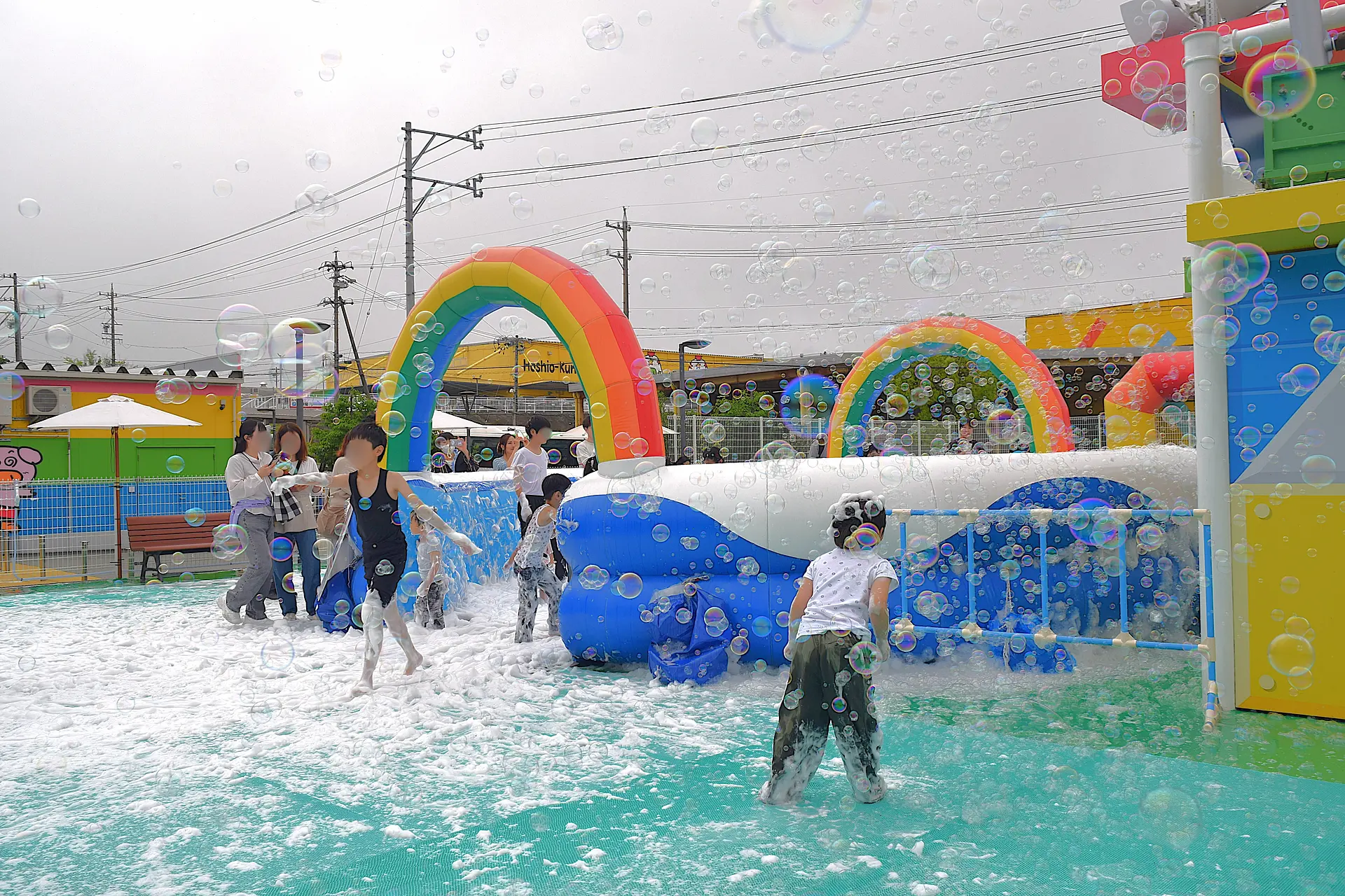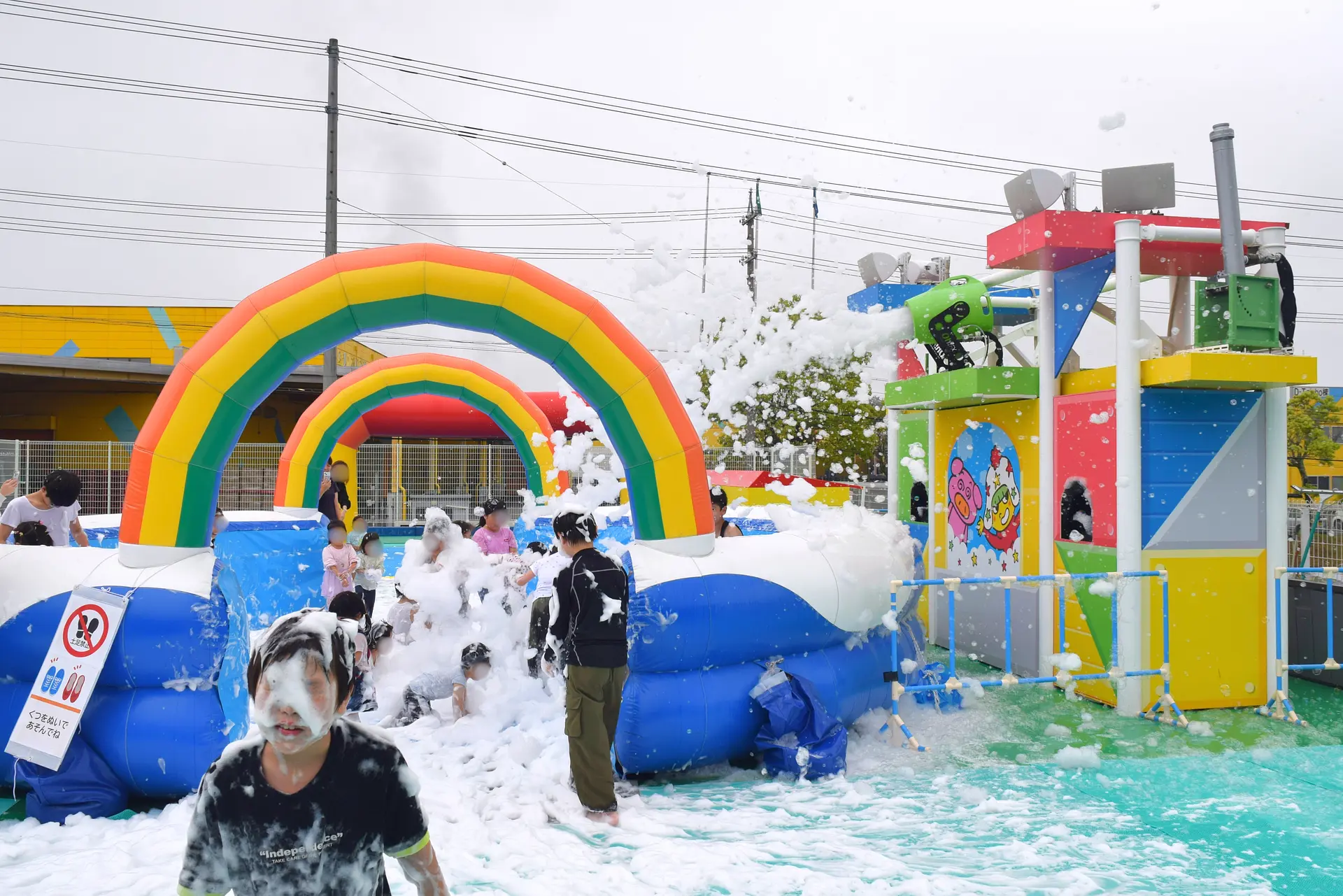 大量の泡が勢いよく噴き出す「泡あわウォーターショー」で、子供たちは泡まみれ!あわあわになる子供たちを保護者が撮影していると…噴水ウォーターが飛び出してびしょ濡れになっちゃいます!