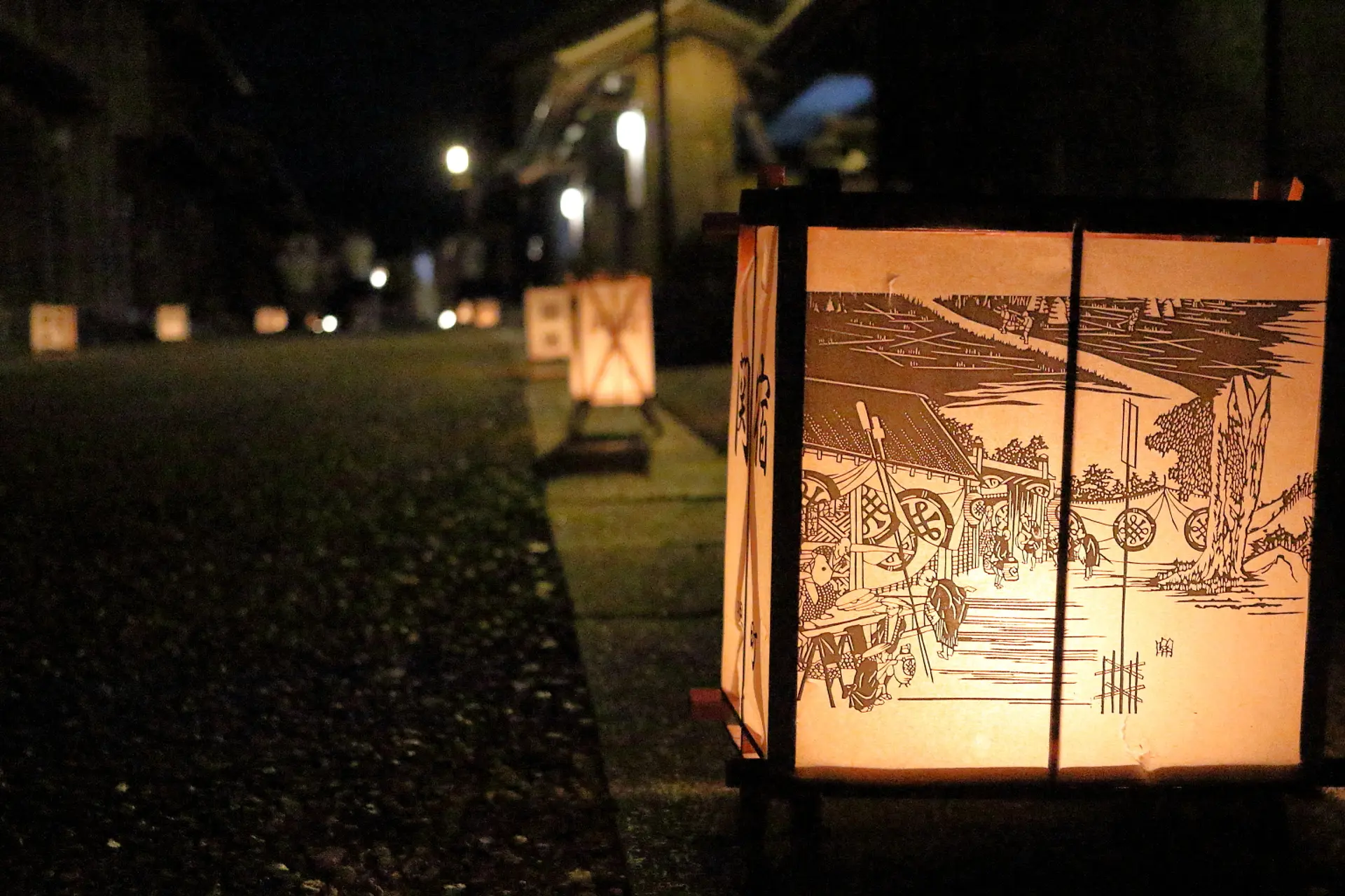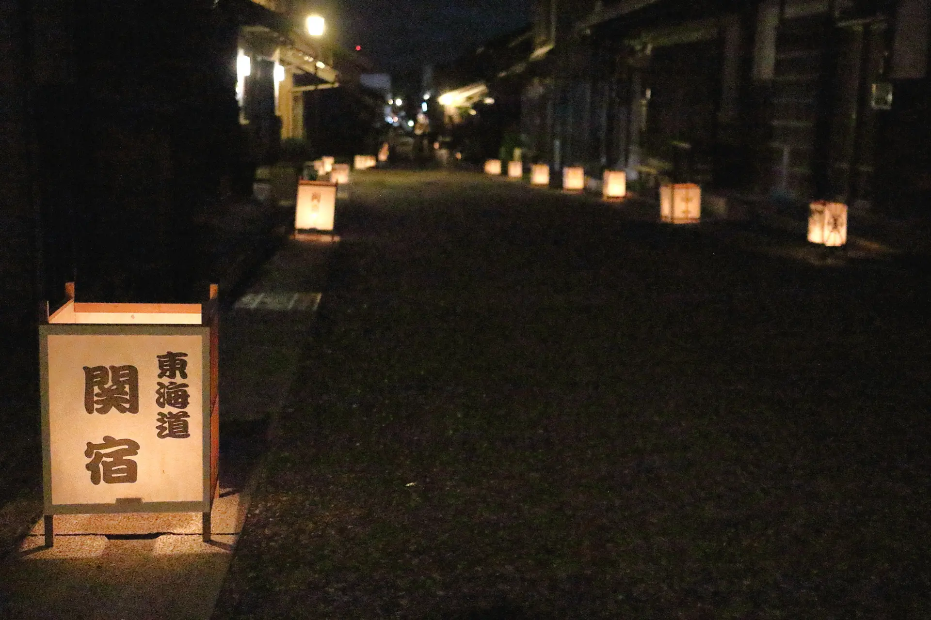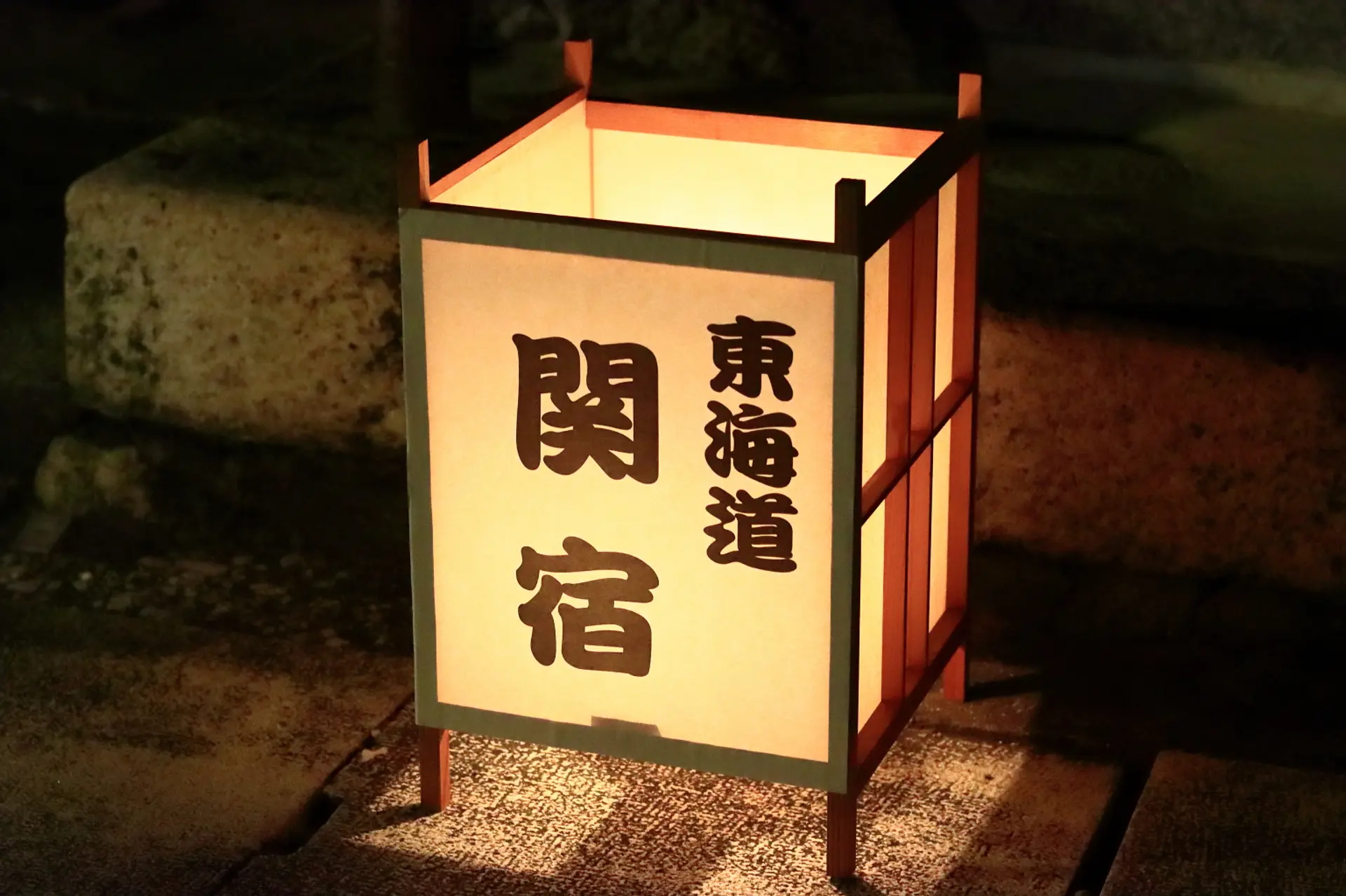江戸時代の関宿の様子でしょうか?昔の関宿の風景を映し出された行灯もあって、昼間とはまた違った幻想的で落ち着いた雰囲気が味わえます。