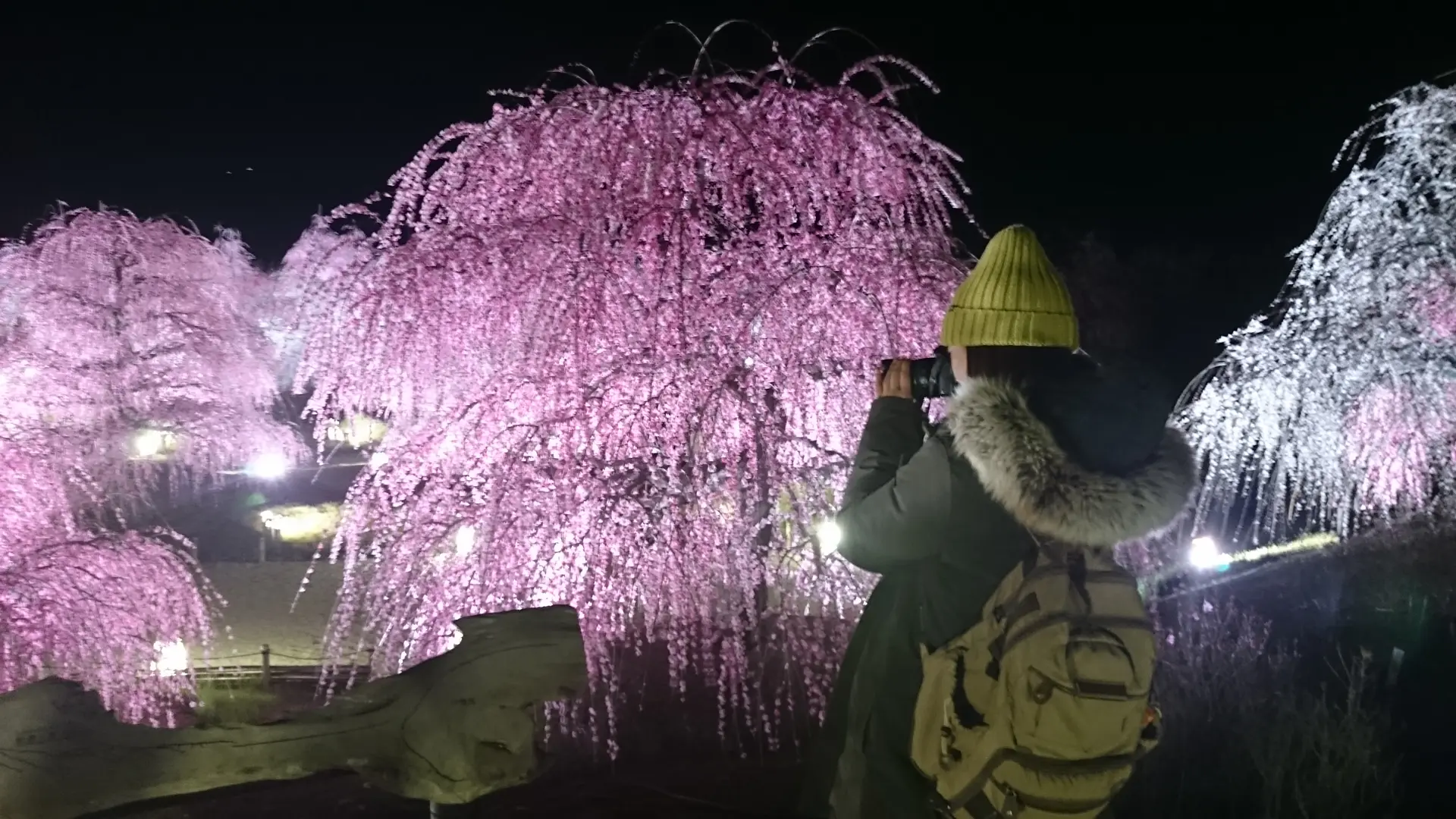 ライトに照らされた枝垂れ梅が浮かび上がる光景は、とても幻想的です。