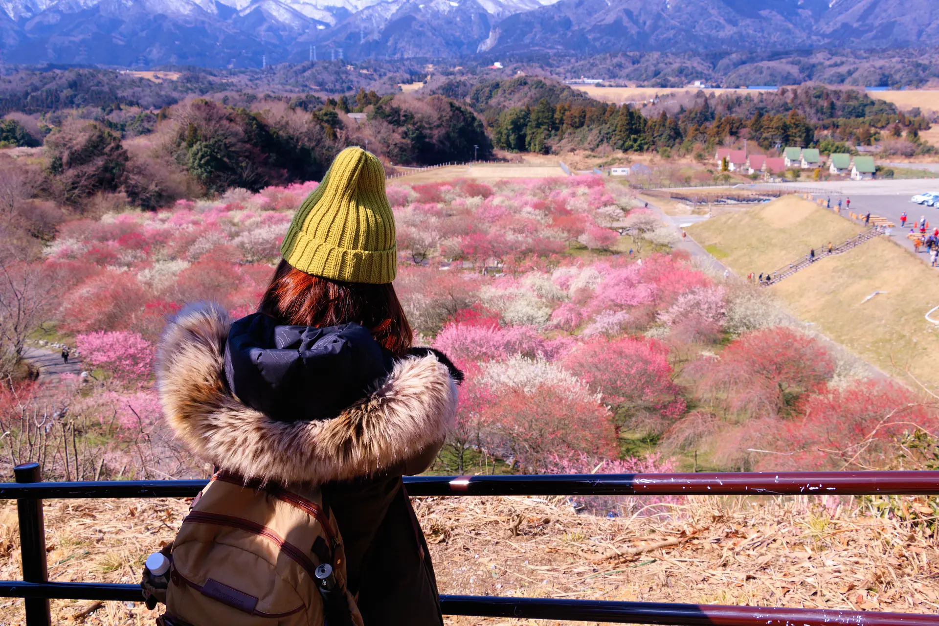 梅林を上から望むと、まるでパッチワークのように色とりどりの梅が眼下に広がります。