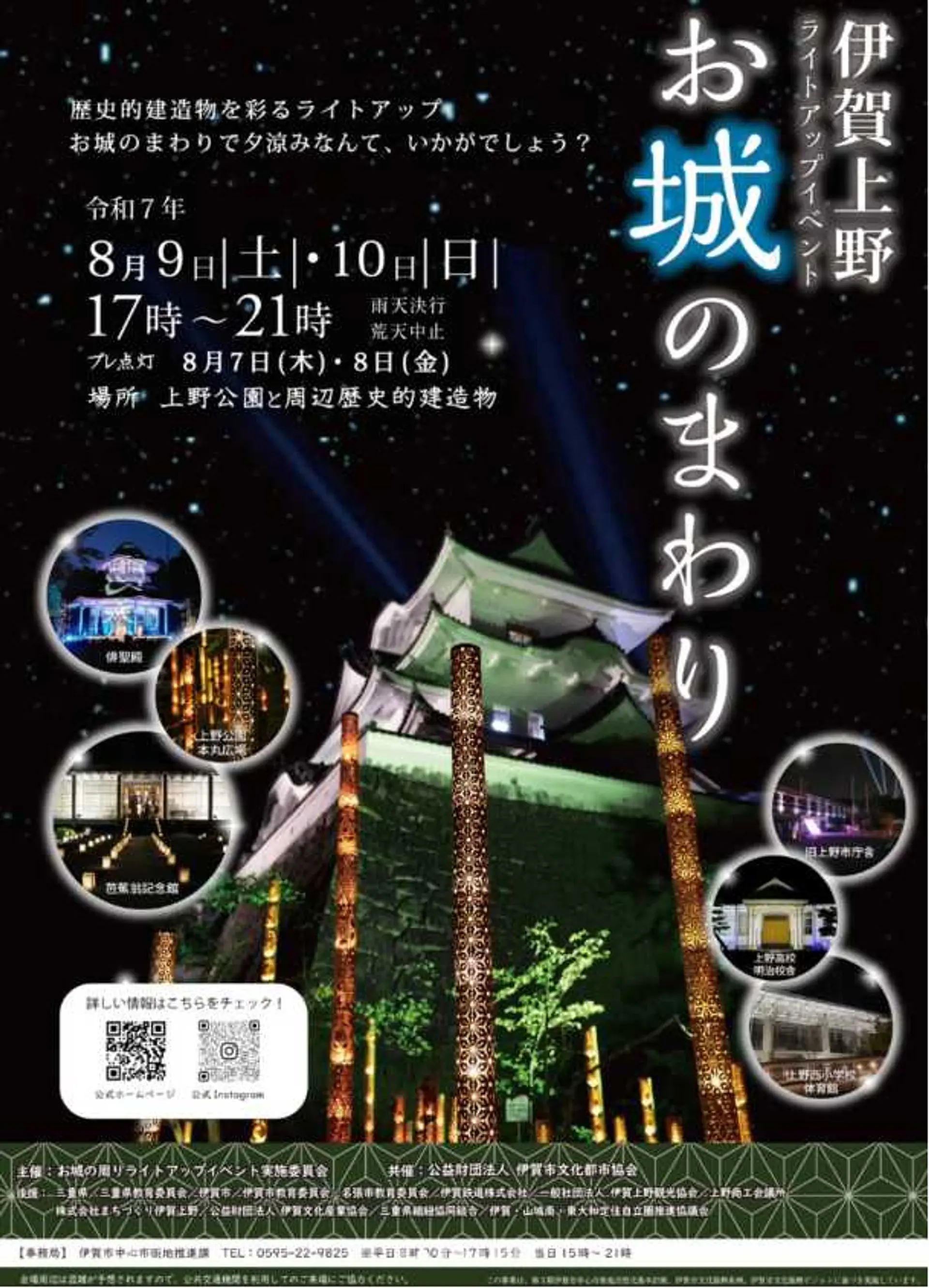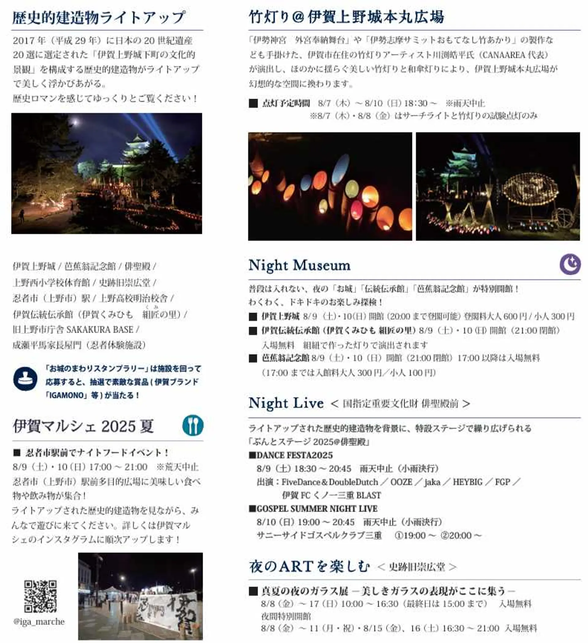 伊賀上野城をはじめ、上野公園及び周辺の城下町の文化財施設や歴史的建造物が美しく幻想的な灯りでライトアップされるとともに、俳聖殿前特設ステージイベント(Night Live)、夜間特別開館(Night Museum)、史跡旧崇広堂での真夏の夜のガラス展(「夜のARTを楽しむ)、忍者市駅前多目的広場でのナイトフードイベント(伊賀マルシェ2025夏)など、見どころいっぱいのイベントです。