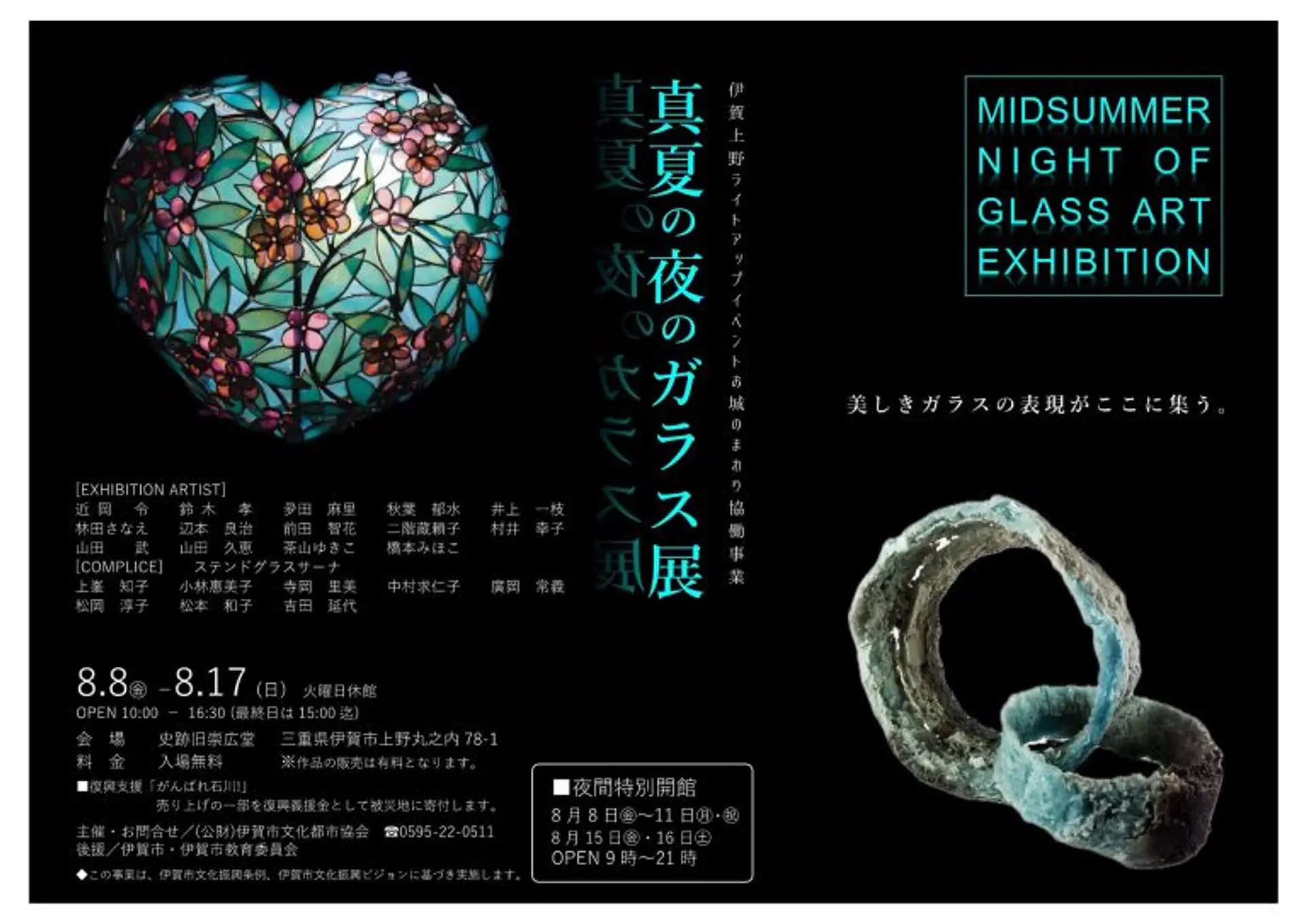 旧崇広堂では、「夜のARTを楽しむ」と称し、素敵なガラスの展示会「真夏の夜のガラス展~美しきガラスの表現がここに集う~」が開催されます。