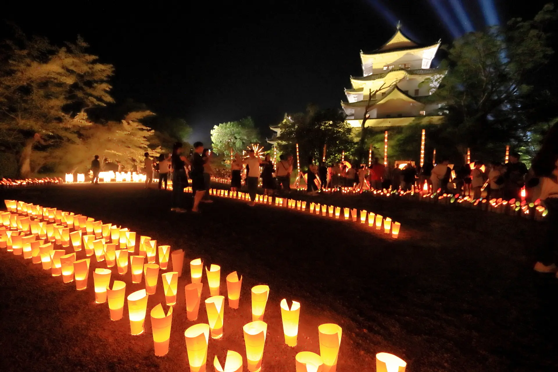本丸広場の竹灯りは、8/9(土)・10(日)だけでなく、8/7(木)・8(金)にも試験サーチライトと竹灯りの試験点灯があり、予定時間はいずれも18:30~(雨天中止)とのことです。
