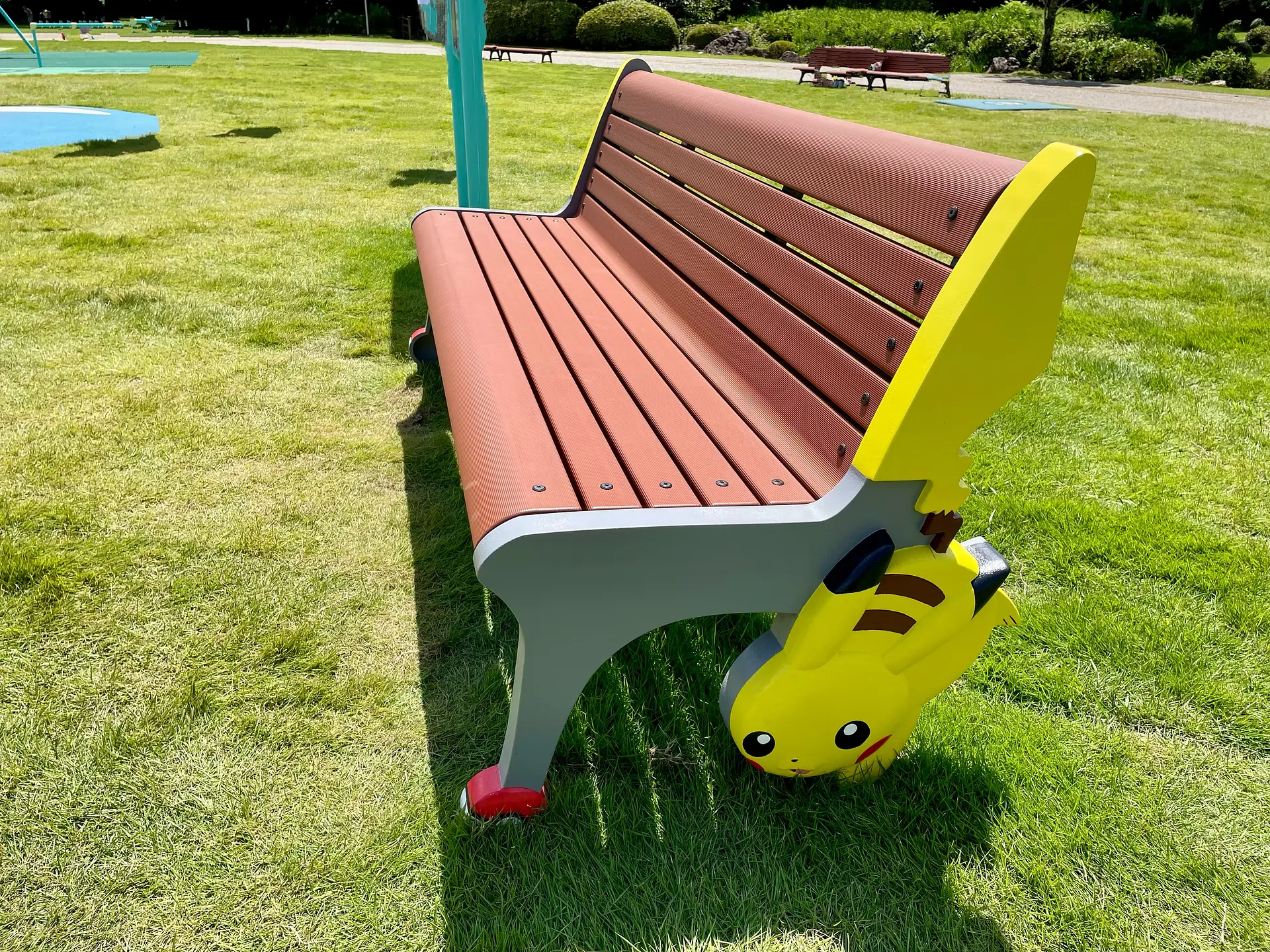 ベンチにもこだわりが。横をよく見ると…ピカチュウとモンスターボールが!
