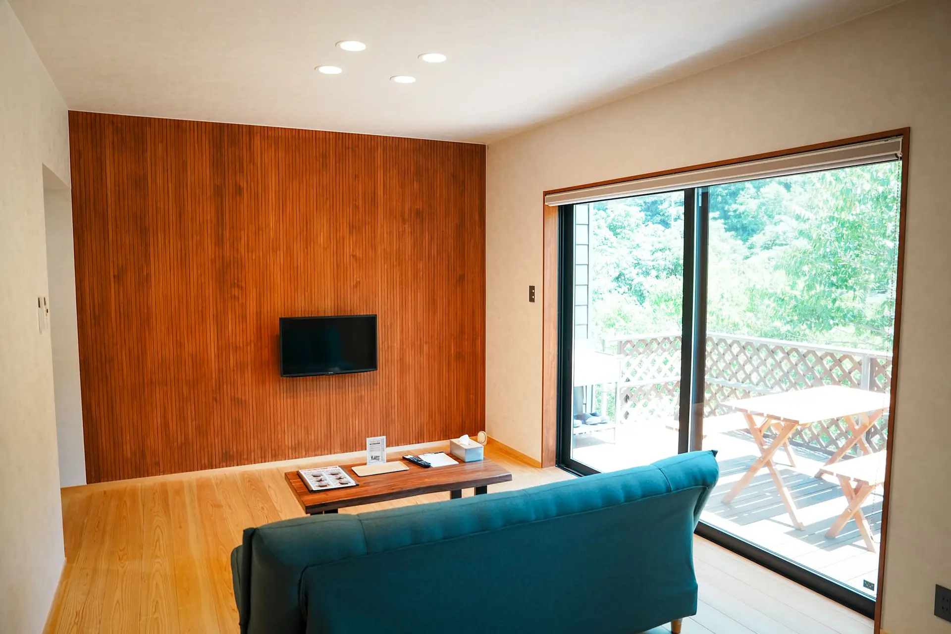 窓からは光が差し込み、開放感があります。テラスにはテーブルと椅子が常設されており、満点の星空を見ながらテラスでくつろげます。無料Wi-Fiやテレビも常設しています。