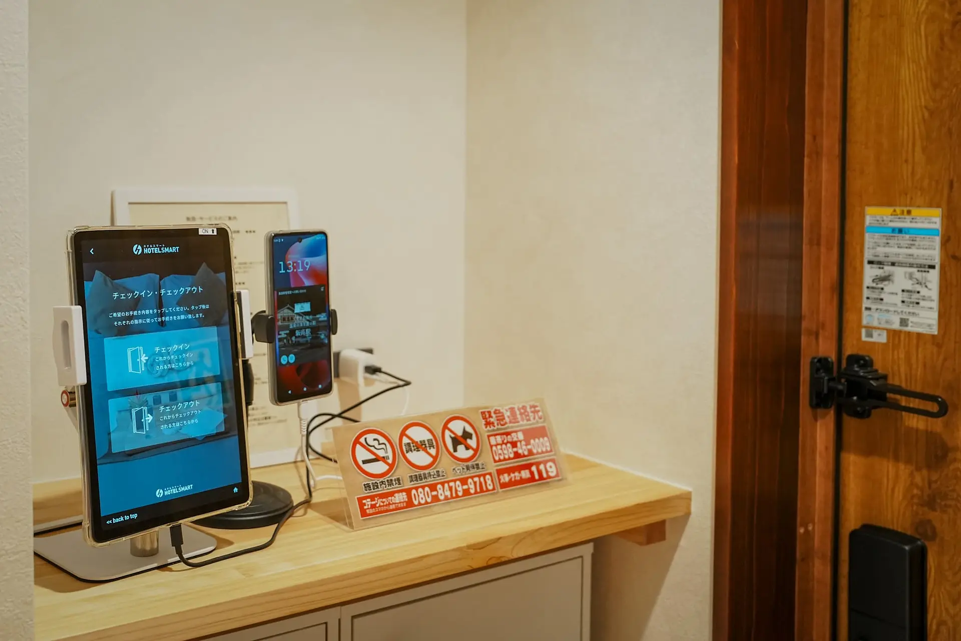 入室後にタブレットにてチェックインの手続きを行います。緊急時のスマートフォンも設置されており、安心。