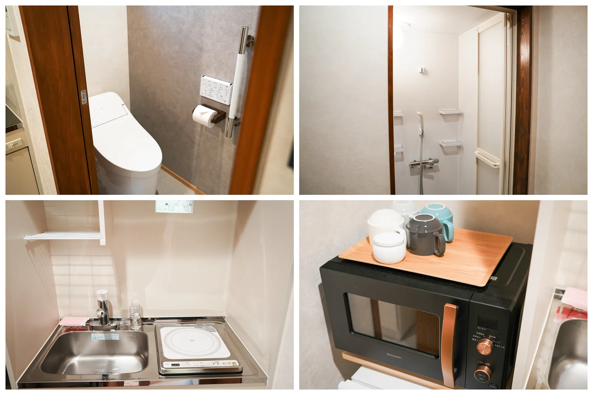 IH式の調理器と流し台、ミニ冷蔵庫、電子レンジ、電気ケトル、マグカップがあります。