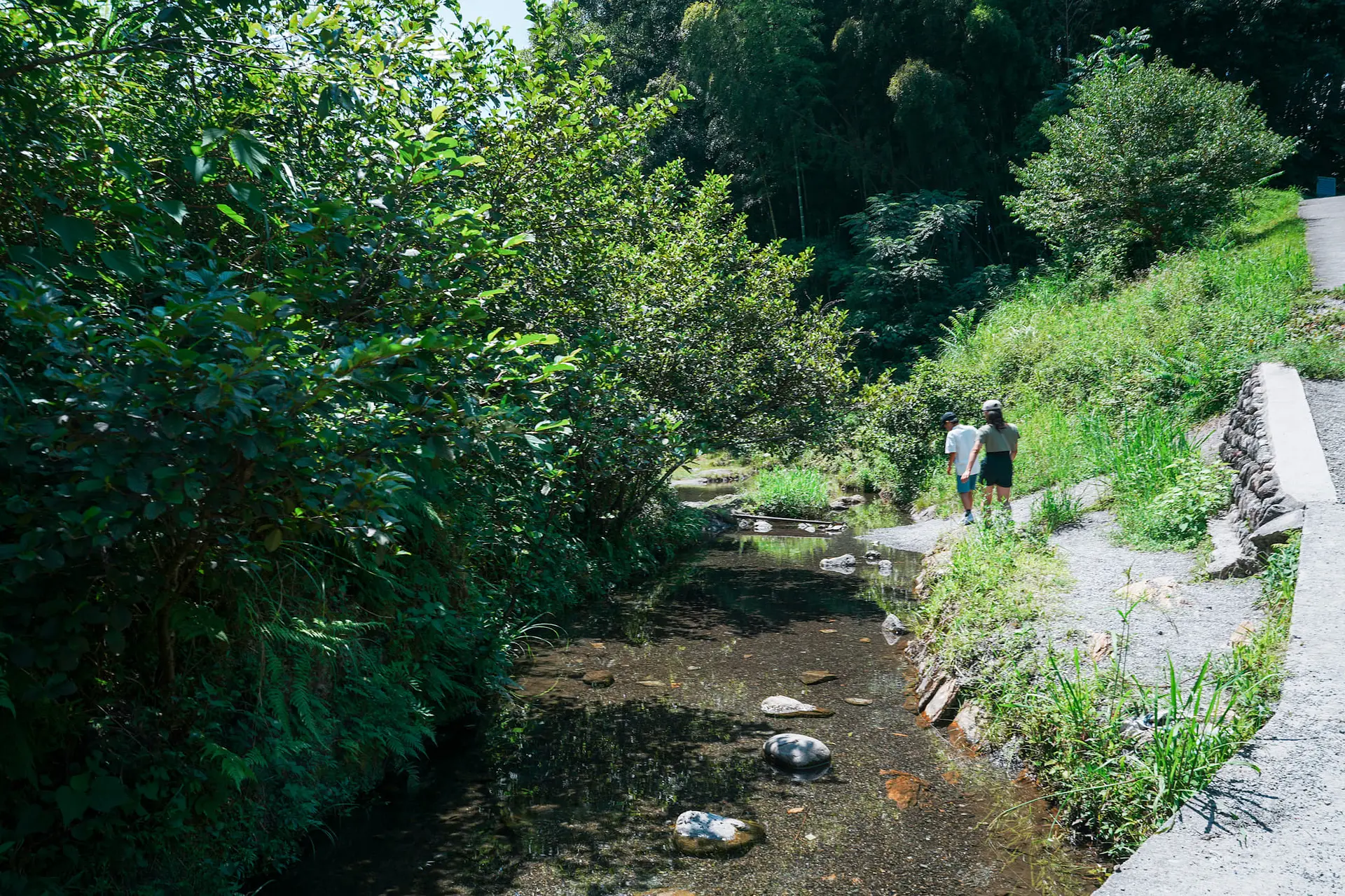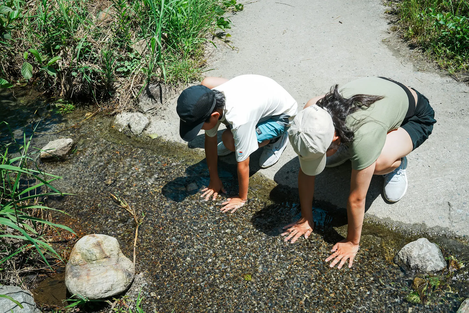 芝生公園の東側にあり、コテージ横の小道を下ると、到着したこどもの水遊び場。足首ほどの水深のため、幼児も安心して水遊びできる場所です。