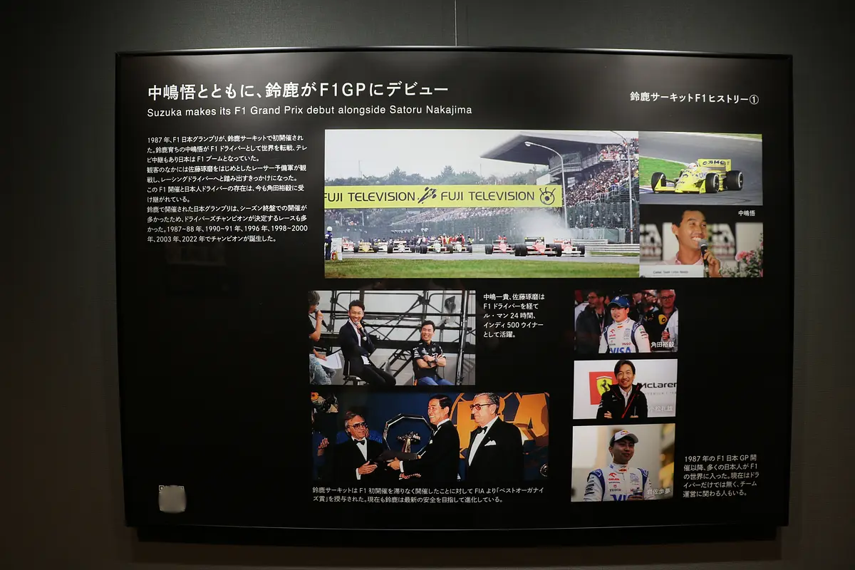 廊下には、鈴鹿サーキットの「レーシングコース」の歴史がわかるギャラリーも!F1や鈴鹿8耐などの歴史、コーススタンドの変遷などがわかります。