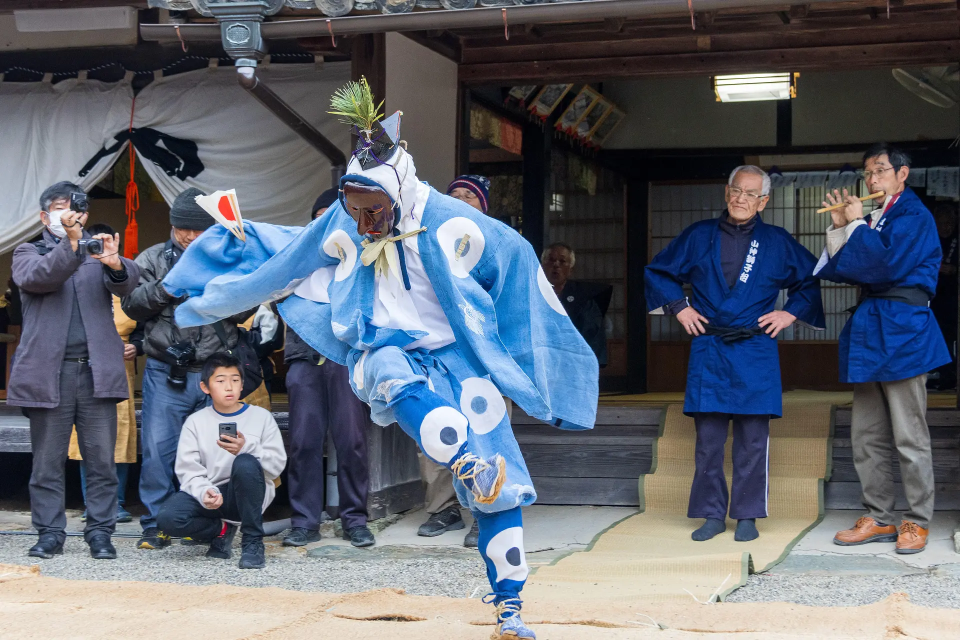 昔ながらの稲わらで作られるしめ縄には、「笑門」や「蘇民将来子孫」と書かれた木製の護符がつけられています。