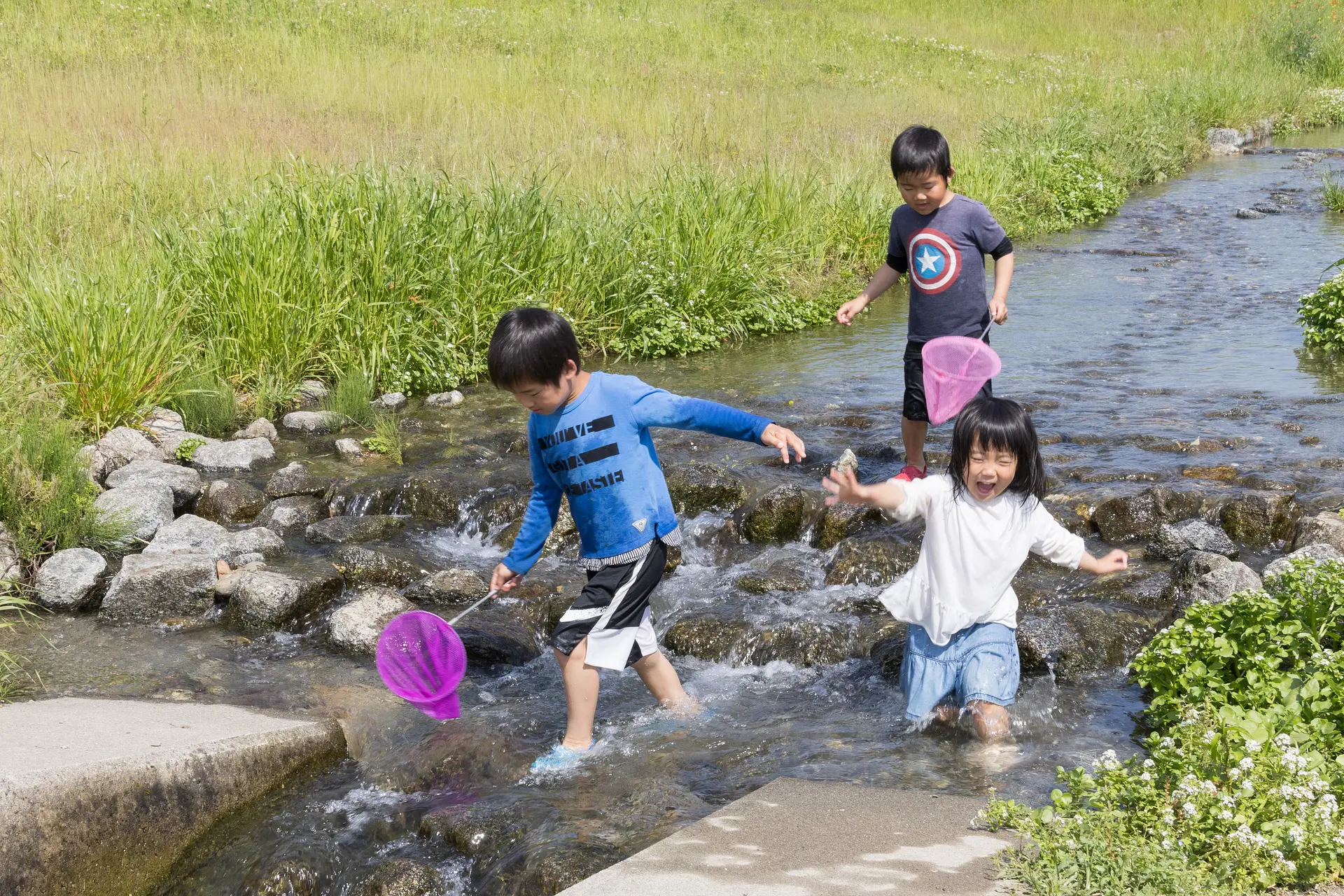 「たまき水辺の楽校」は、自然体験・環境学習の場として利活用できるように、広さを確保した「アクティブスペース」・「せせらぎ水路」・「散策路」等が整備され、キャンプや水遊びの場として親しまれています。