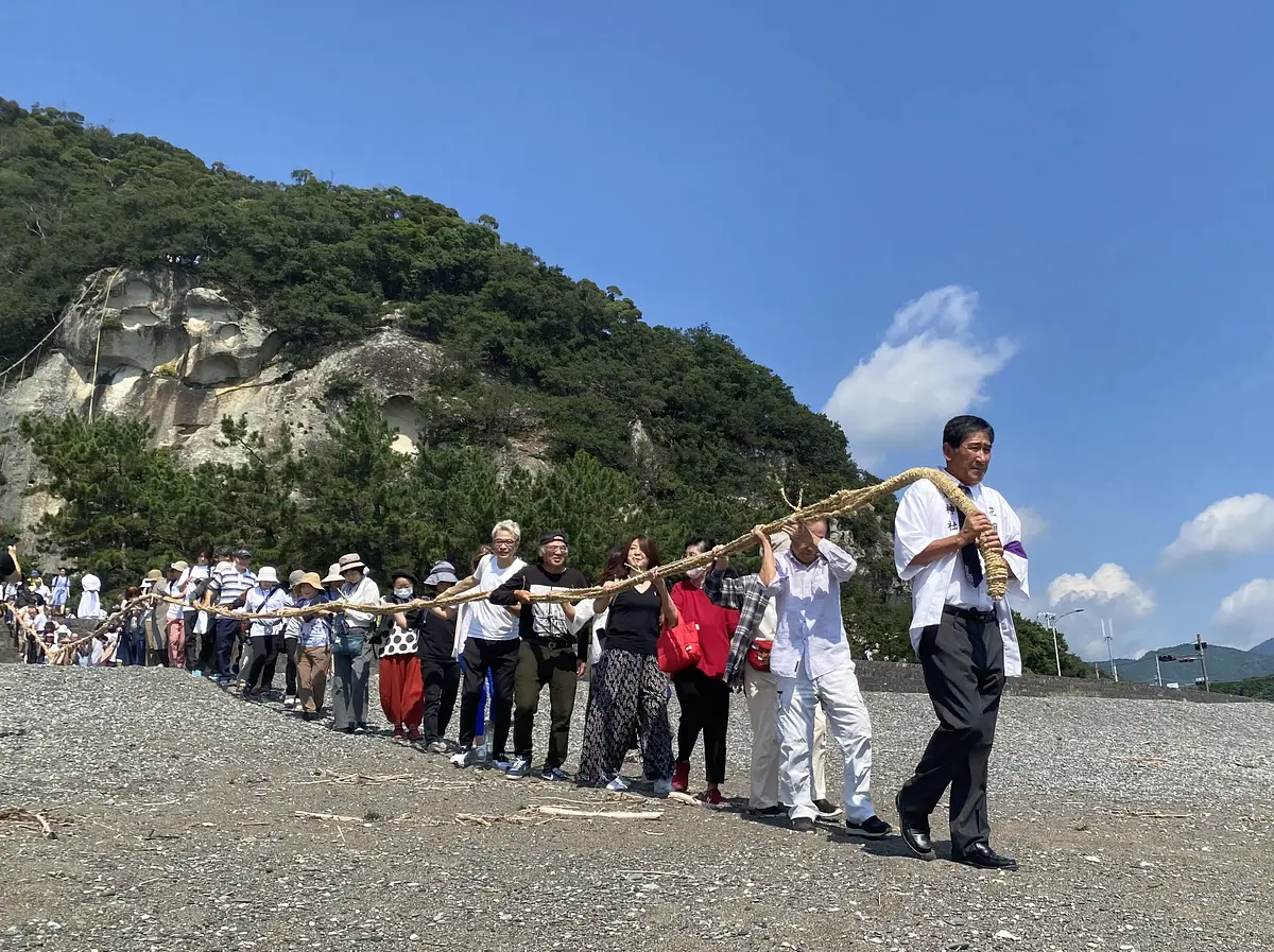 花の窟では年2回、例大祭が行われています。神々に舞を奉納し、約170mの大綱を約45mの高さのご神体から境内南隅の松のご神木にわたします。この「お綱掛け神事」は三重県無形民俗文化財に指定されています。