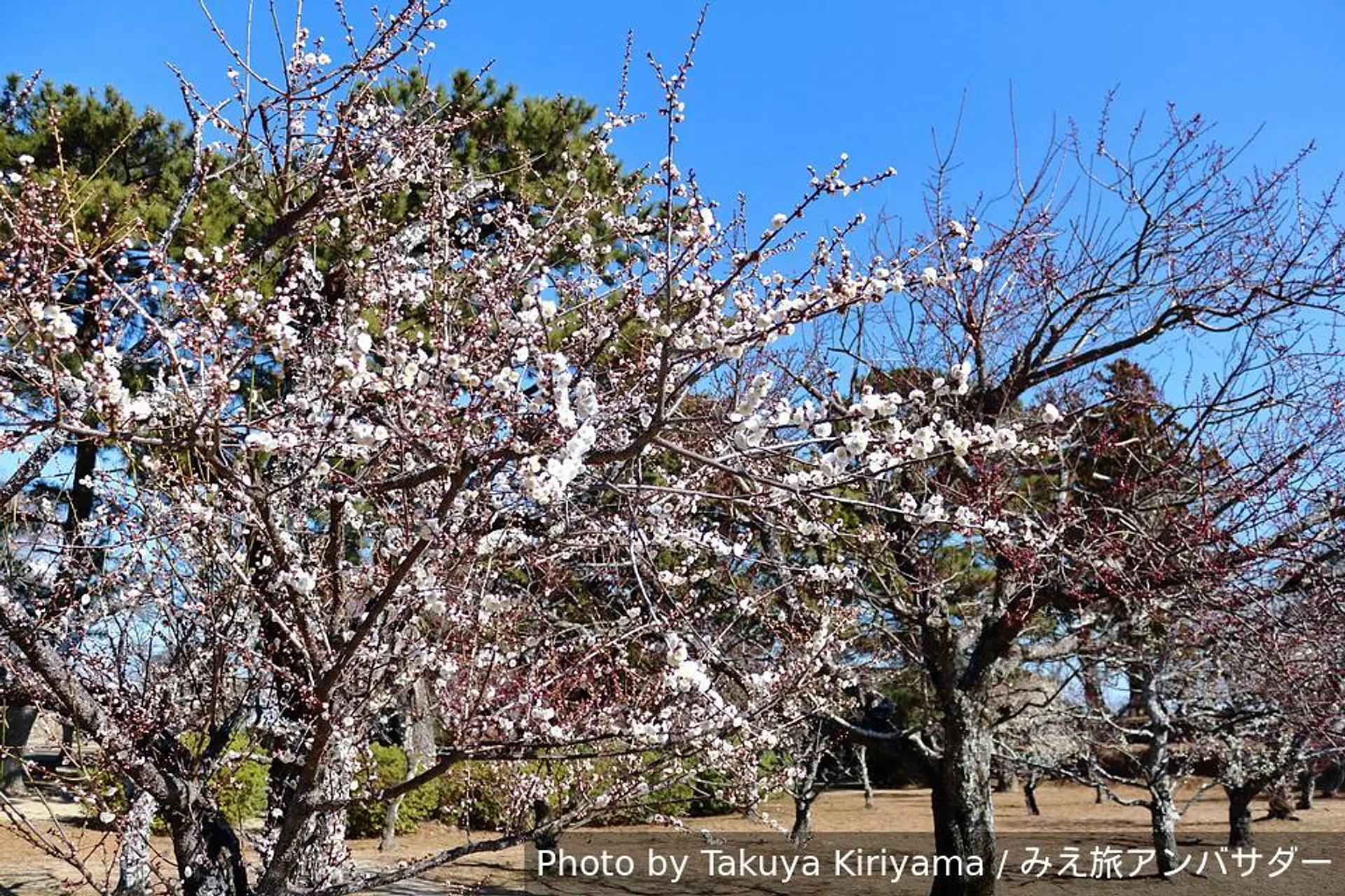 松坂城跡の梅林は、廃城後に城跡が「松阪公園」として整備される中で造られたものですが、本丸西側の「きたい丸跡」にあることから、眺望もよくて城跡ならではの風景も併せて楽しめます。