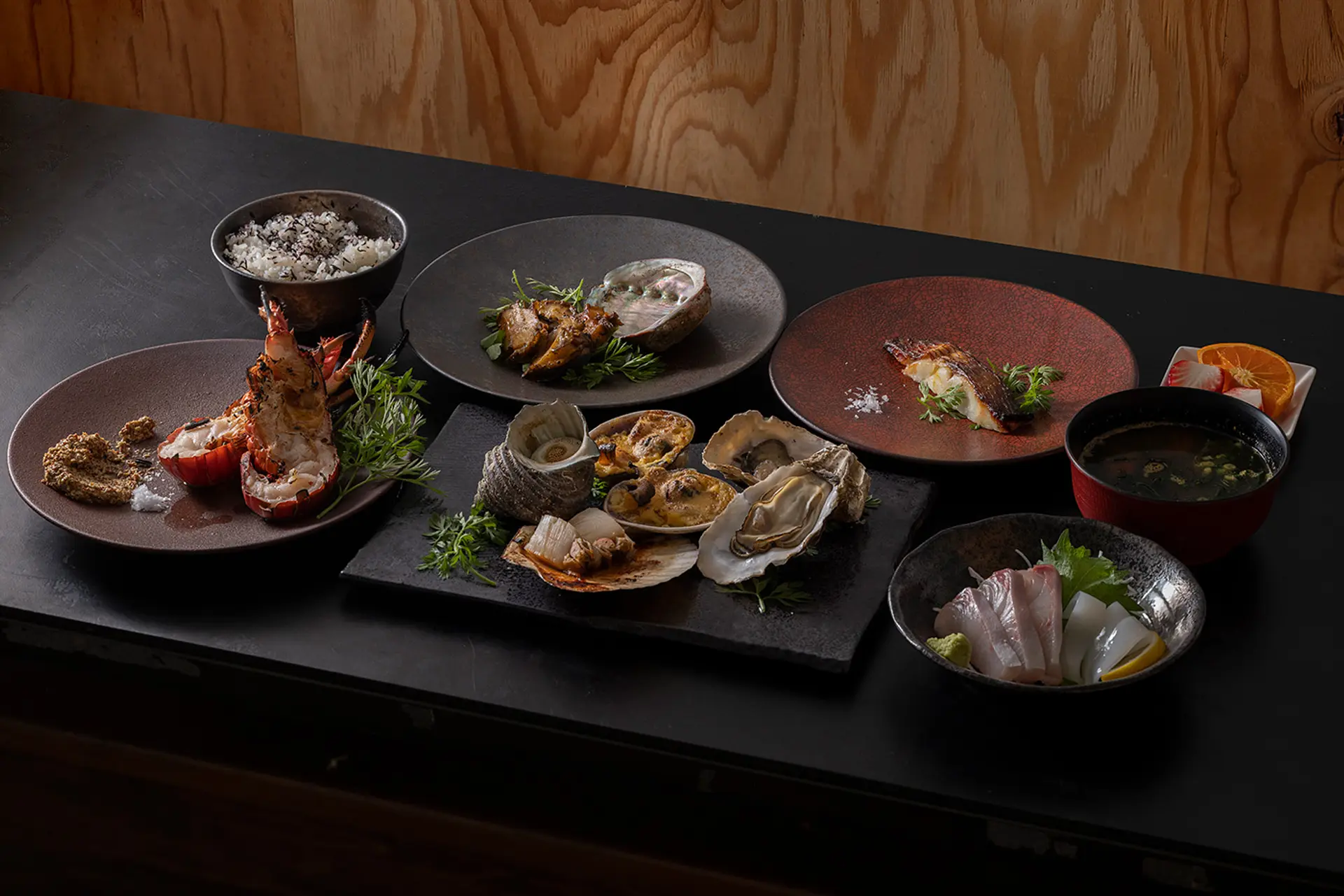 - メニュー:焼き牡蠣、ひおうぎ貝、あわび、伊勢エビ、サザエ 他