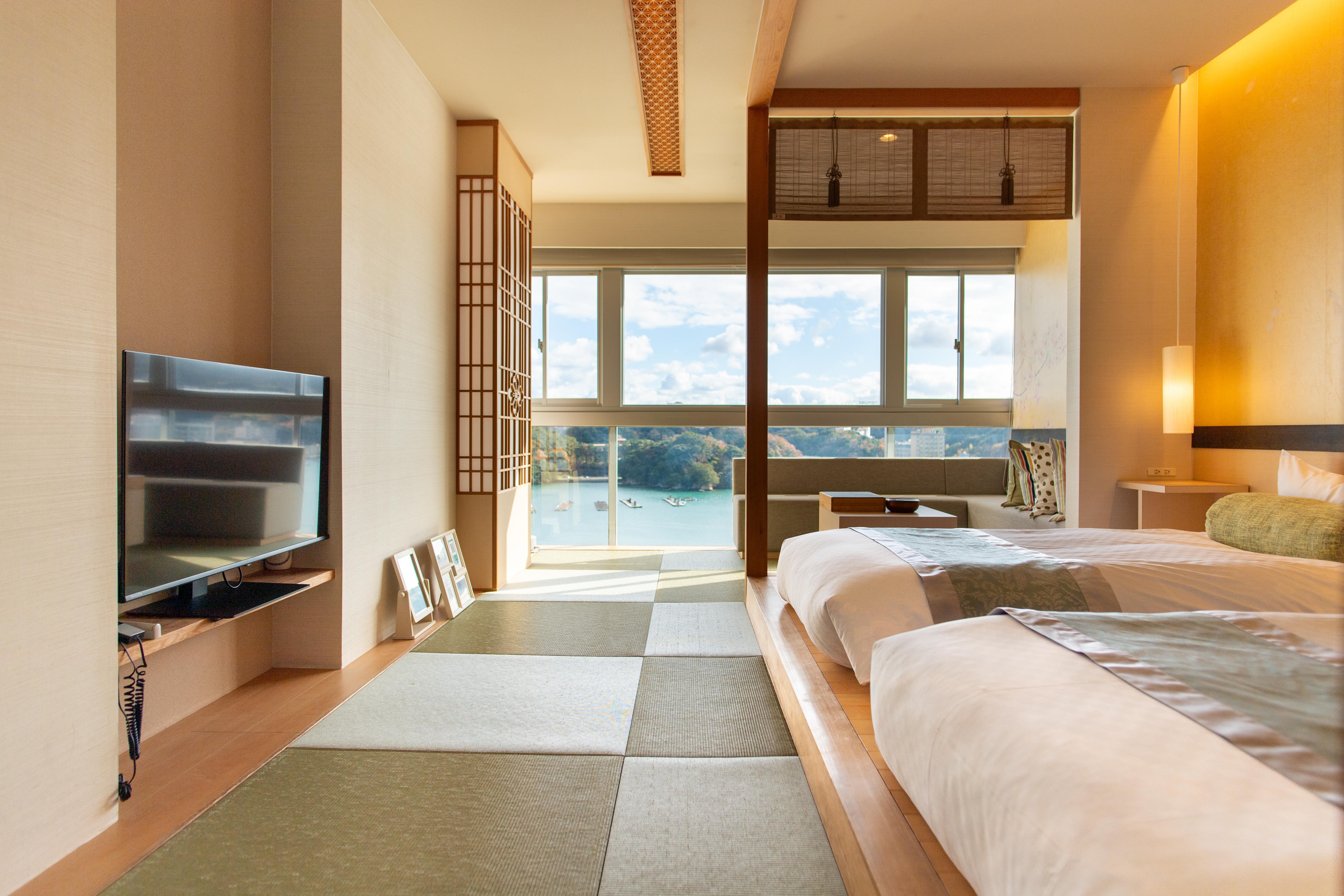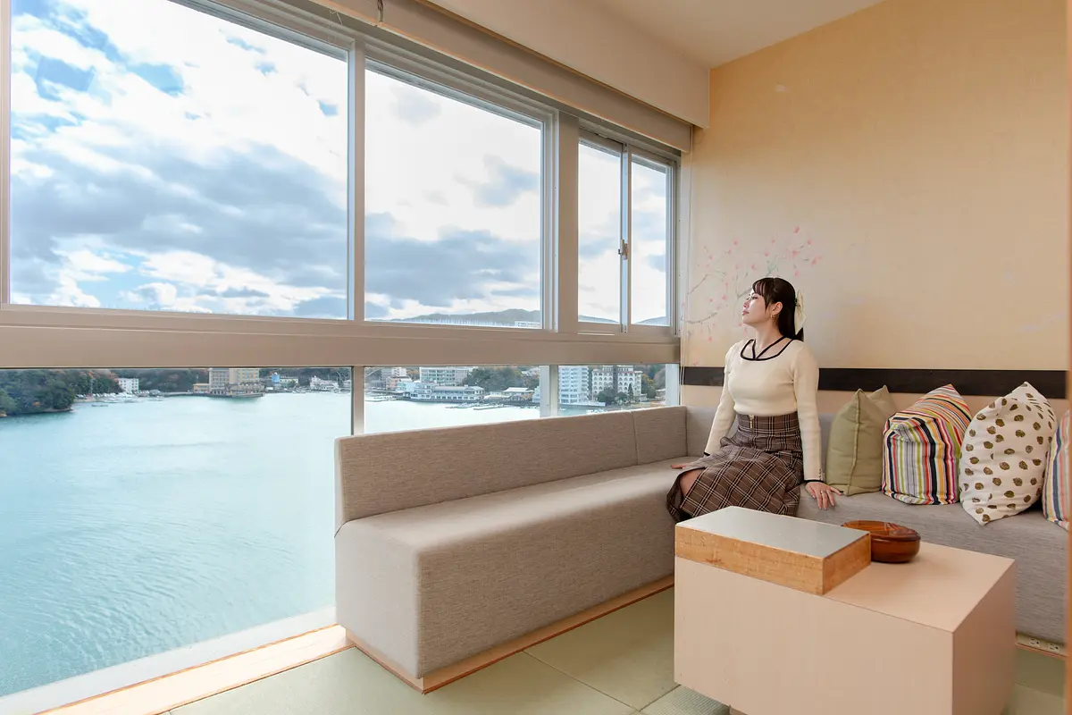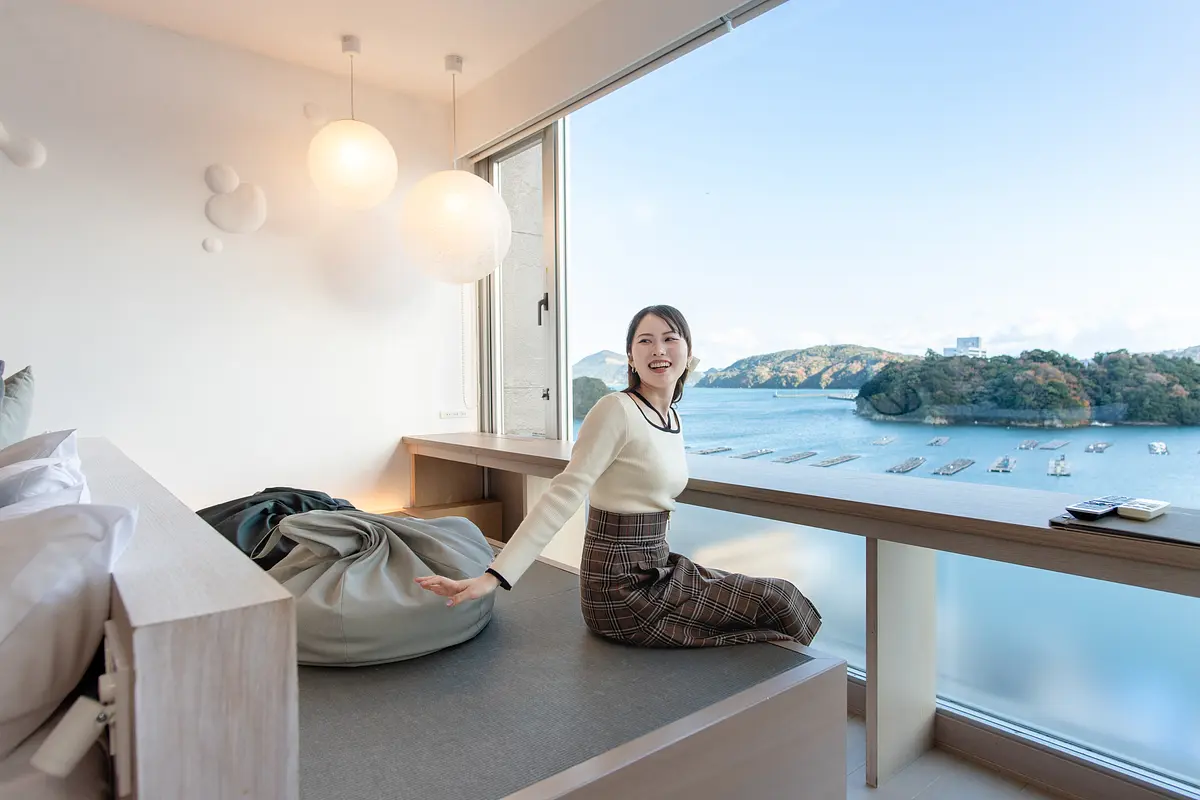 「畳は落ち着きますよね。しかも和モダンでおしゃれ。特等席はL字のソファです。ここからも鳥羽湾が一望でき、牡蠣養殖の筏や漁船が見えるのも楽しいですね」