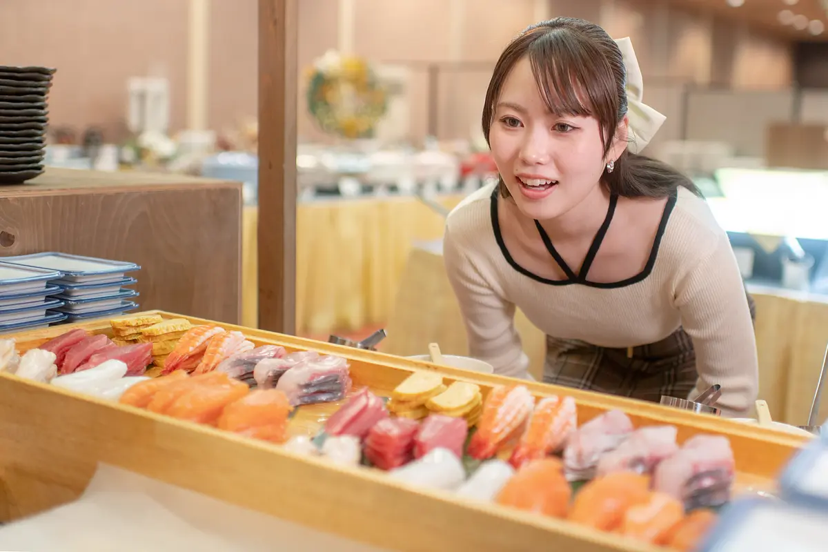 握り寿司のカウンターで楽しそうにネタを選ぶえりかさん。大きめの寿司ネタで種類も豊富。