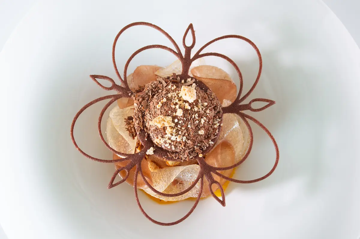 甘さ控えめの上質なチョコレートで、キャラメルアイスやメレンゲを包み込み、周囲には不知火(しらぬい)や柚子ジャムなどの柑橘が配置されています。チョコレートの深いコクと、柑橘の爽やかな酸味。濃厚なのに後味はすっきり。計算し尽くされた味のコントラストが調和し、最後まで飽きることのない至極のデザートです。