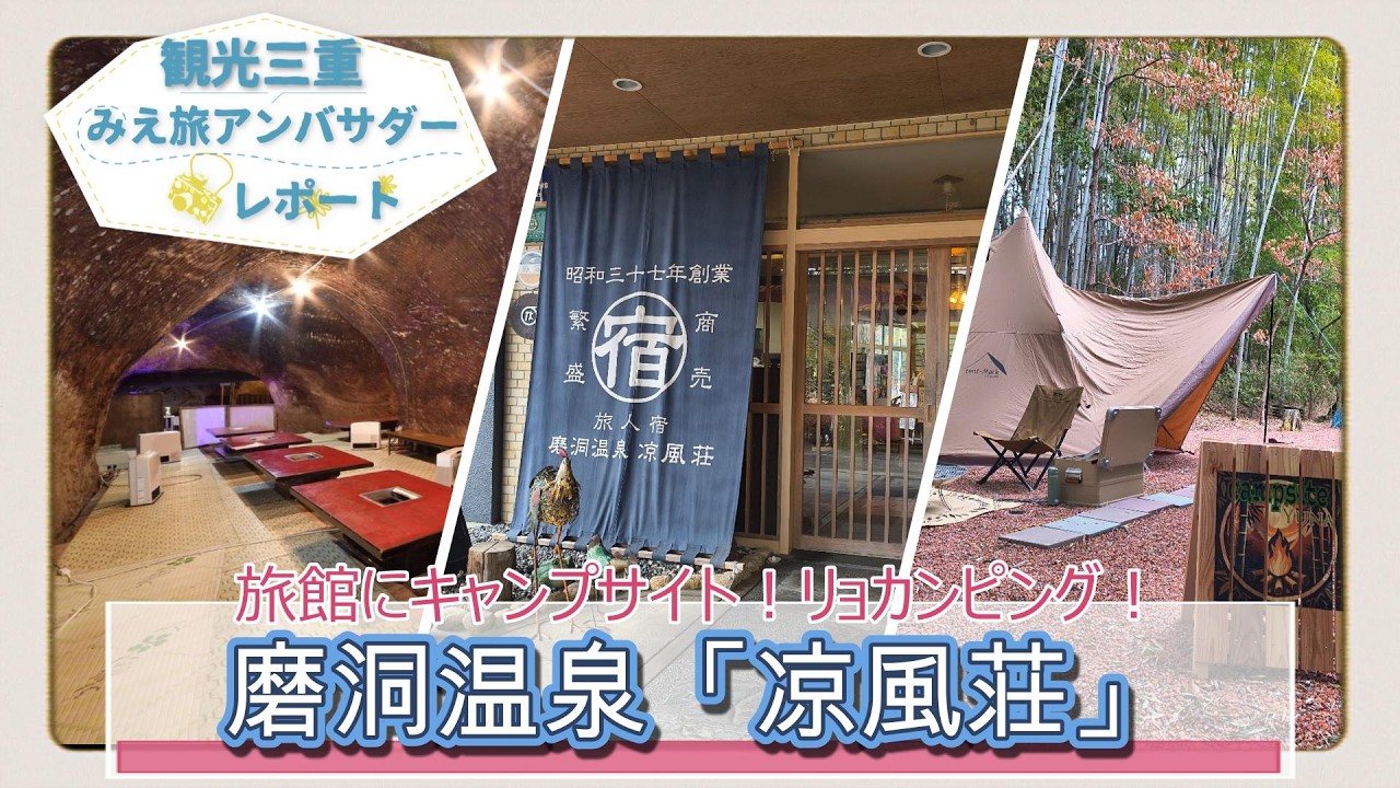 磨洞温泉「凉風荘」は、創業64年の歴史を持つ津市の老舗旅館です。温泉や食事を楽しめる旅館でありながら、敷地内にはキャンプサイトも併設されており、旅館の安心感と外遊びの自由を一度に味わえるのが魅力。洞窟風呂や洞窟座敷といった珍しい施設もそろい、ここでしか体験できない“非日常”が広がっています。さらに今回、新たに姉妹店のキャンプサイトが誕生したとのことで、そちらもあわせてご紹介します。