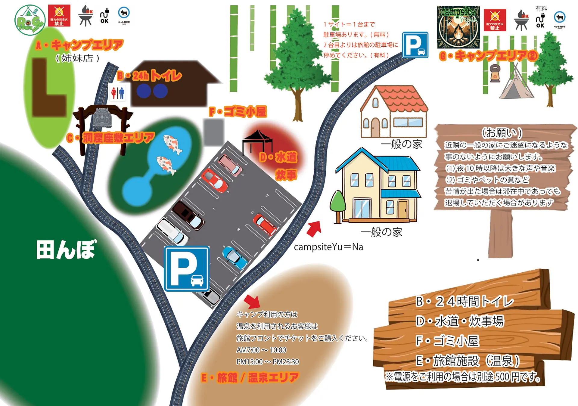 車の横づけはできませんが、近く(約5m)まで乗り入れられます。荷物を降ろしたら車は駐車場へ移動してください。エリア内にはWi‑Fiが完備され、電源(無料)も利用可能、ペットと一緒にキャンプすることもできます。また、LINEで友達追加をすると「凉風荘」の温泉入浴券がもらえる特典もあります。レンタル用品にはこたつもあり、冬キャンプにもぴったりです。