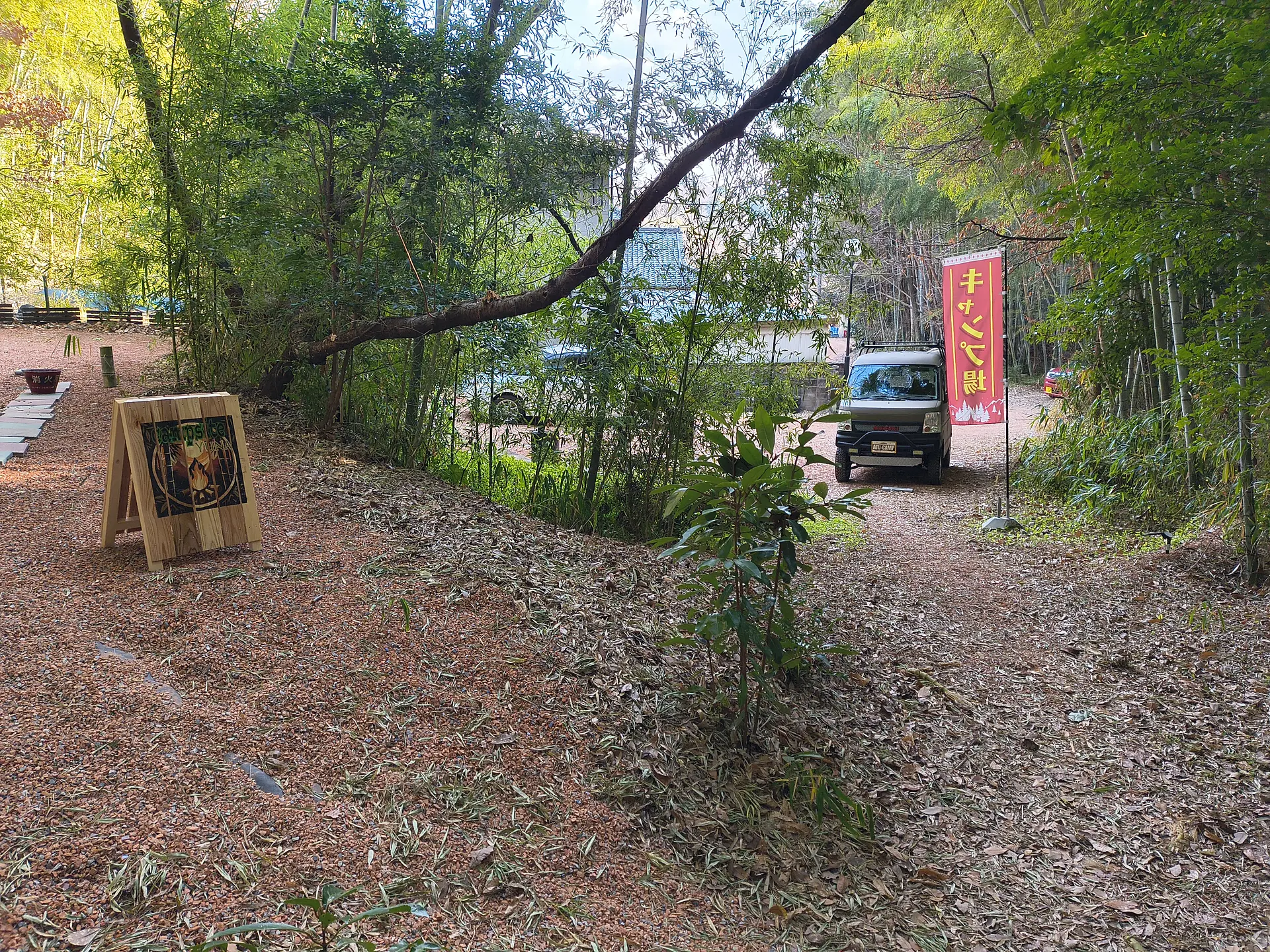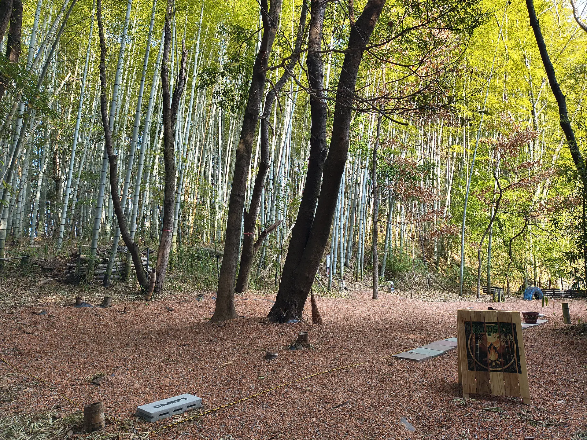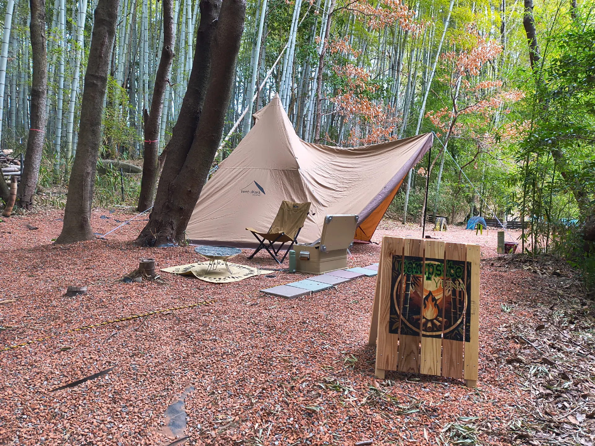 2025年5月にオープンしたCampsite「YU=NA」には、少人数向けのサイトが2区画あります。津市中心部から車で10分ほどとは思えない、竹に囲まれた里山です。 各サイトの広さは 8.93m × 5.55m と 8.13m × 5.5m。レンガチップが敷かれ、ソロやデュオキャンプにちょうどよいサイズ感で、落ち着いた時間を楽しみたい方にぴったりです。