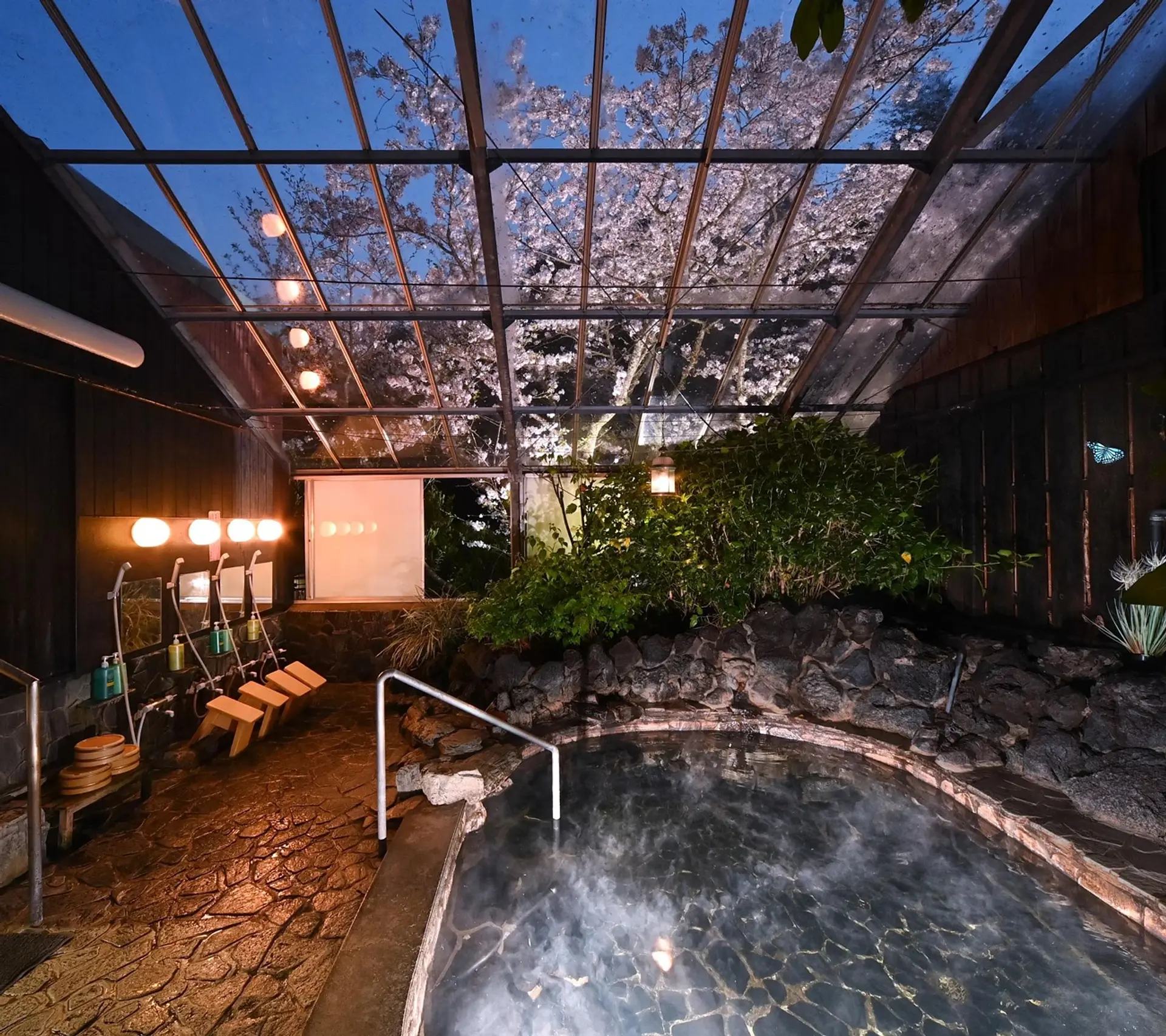 屋根には大きなガラス窓があり、自然光が差し込む開放的な造りになっています。春には男湯から桜を眺められ、季節ごとの景色とともに湯あみを楽しめます。