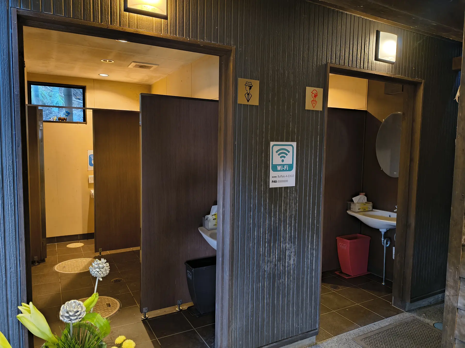 「凉風ガーデン」とCampsite「YU=NA」の共有施設として、24時間利用可能なトイレ(ウォシュレット付きの洋式)と炊事場があります。トイレは「地底の楽園」の入り口付近にあり、Campsite「YU=NA」からは徒歩2分ほど離れています。