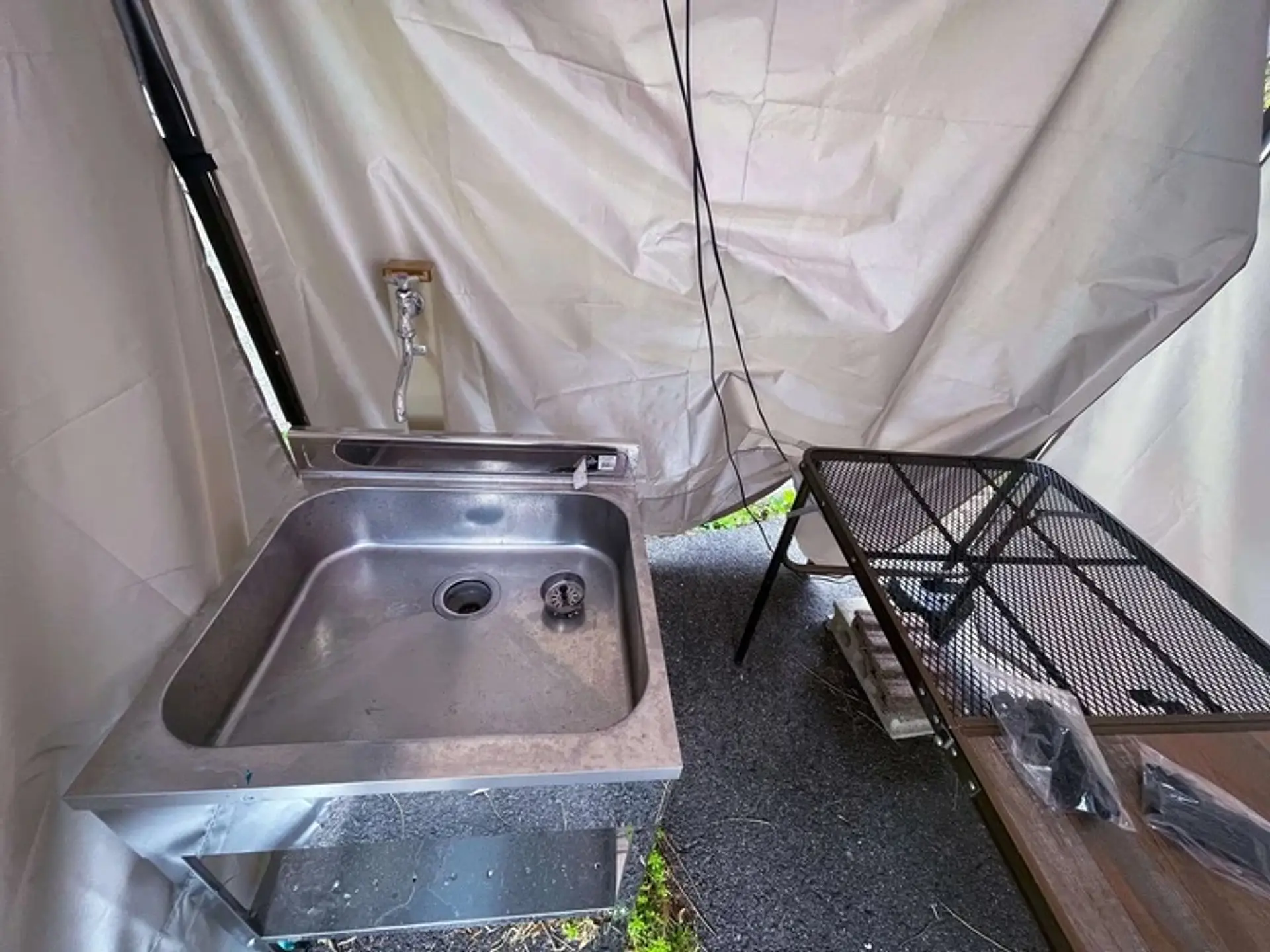 炊事場は「凉風荘」駐車場にあります。Campsite「YU=NA」からは徒歩2分ほど離れています。