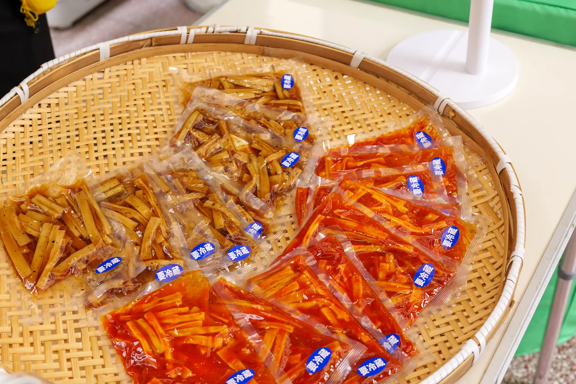 大きくなりすぎたタケノコを使った味付けメンマ(500円/70g入) 醤油味・ピリ辛トマト味・ラーメン味の3種類(この日は2種類の販売)