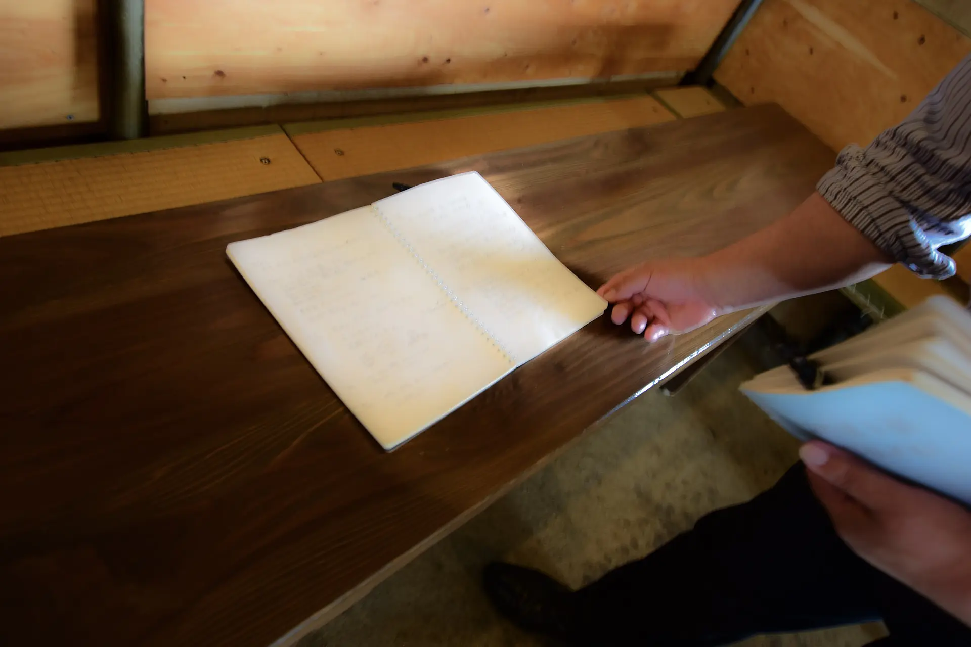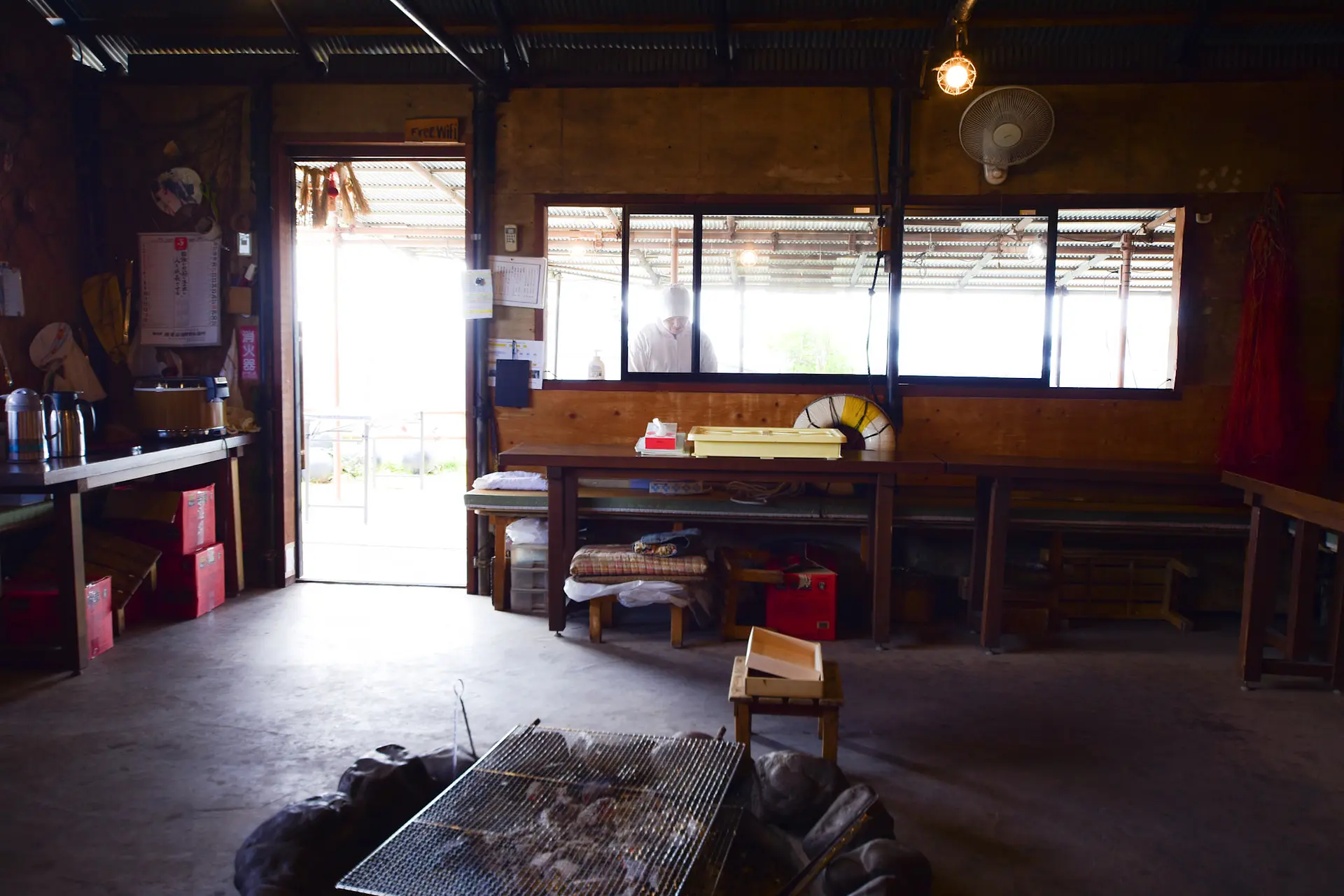 案内された小屋の中。海女さんの使う道具がいろいろと置いてあり、ご飯を準備してくれる海女さんの姿が見えます。