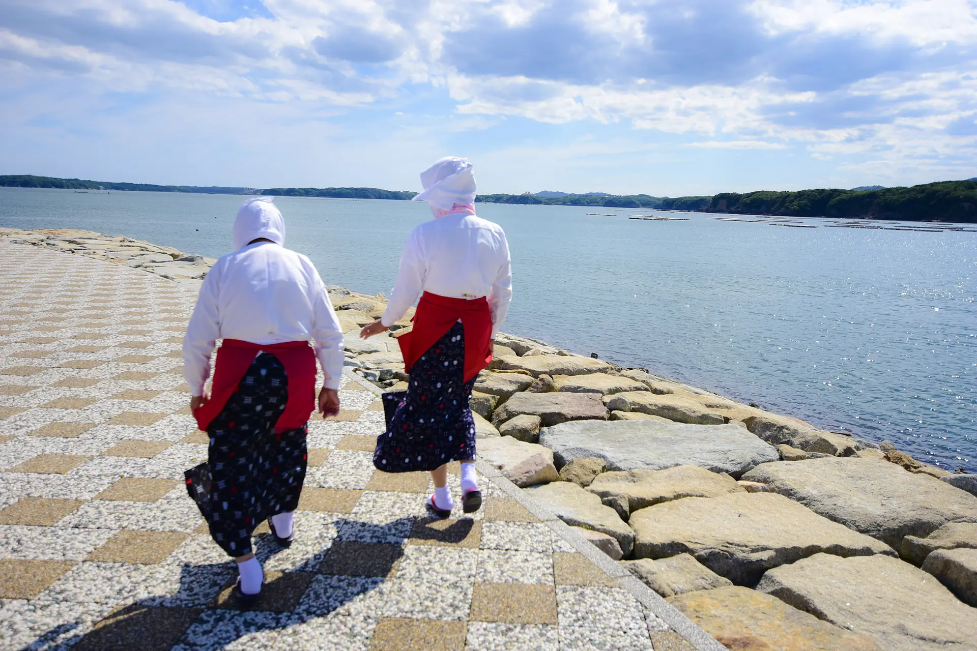 「はちまんかまど」の目の前に広がるあさり浜に沿った堤防の先まで、海女さんたちが案内してくれました。
