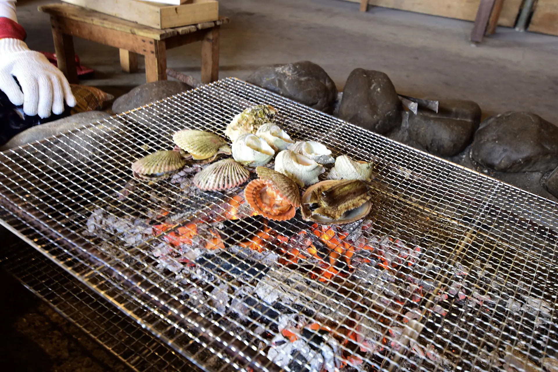 海女さんが丁寧に炙ってくれます。獲れたての貝を焼いてすぐに食べられるなんて贅沢このうえありません。
