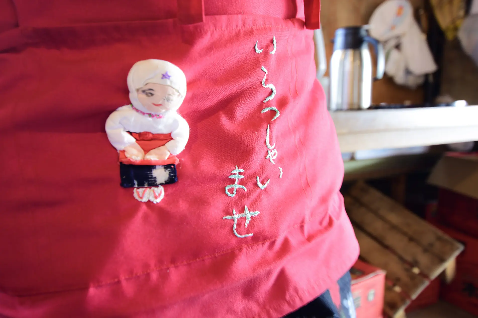 かわいい海女さんの前掛け。歓迎のあいさつ「いらっしゃいませ」の横には、ぺこりとお辞儀をした海女さんのマスコット。手作りとのこと。