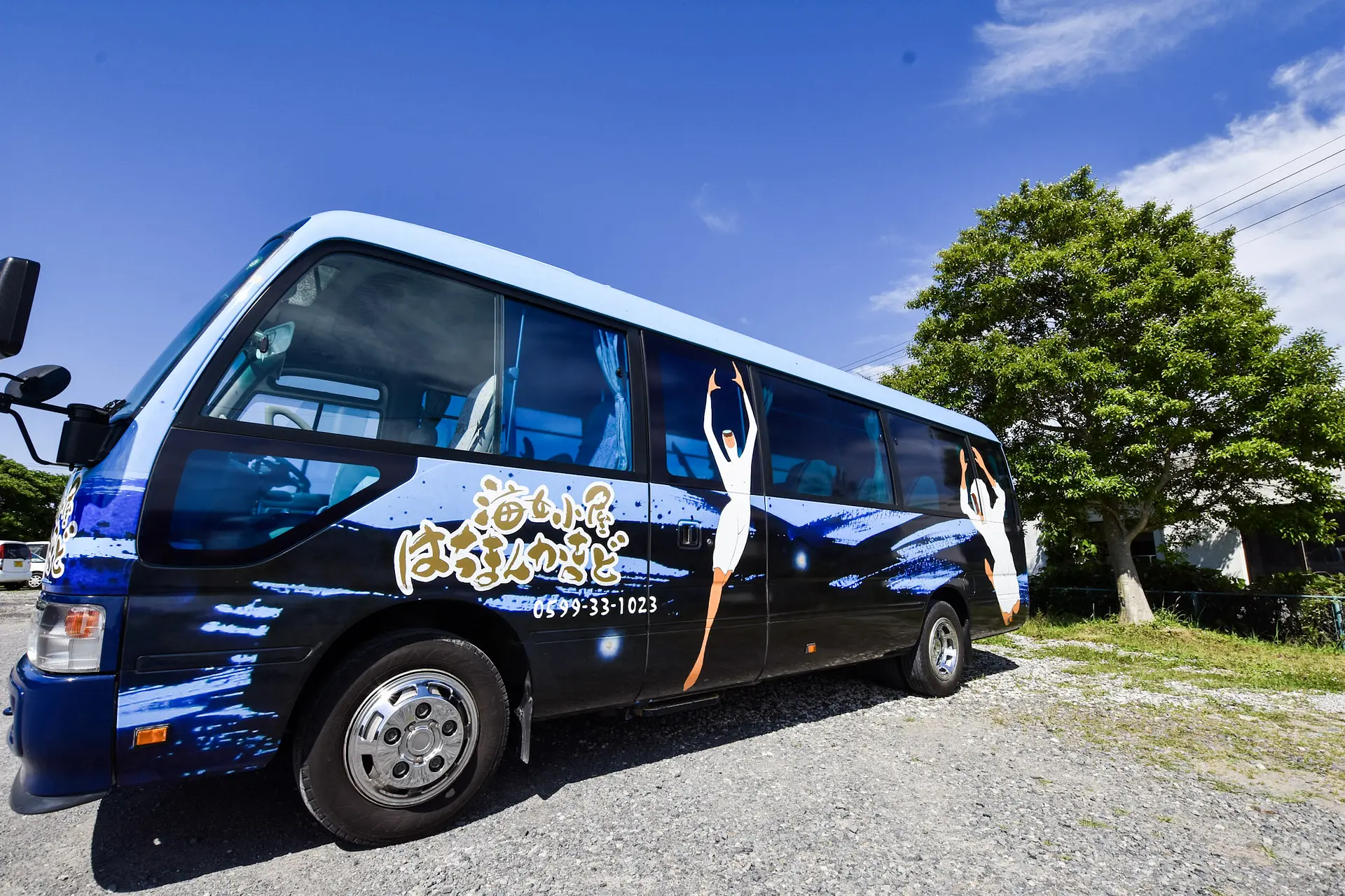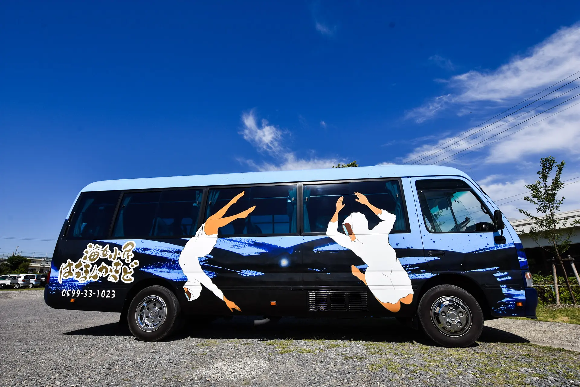 今にも動き出しそうな海女さんたちがデザインされた、目を引くラッピングの「はちまんかまど」専用バス。