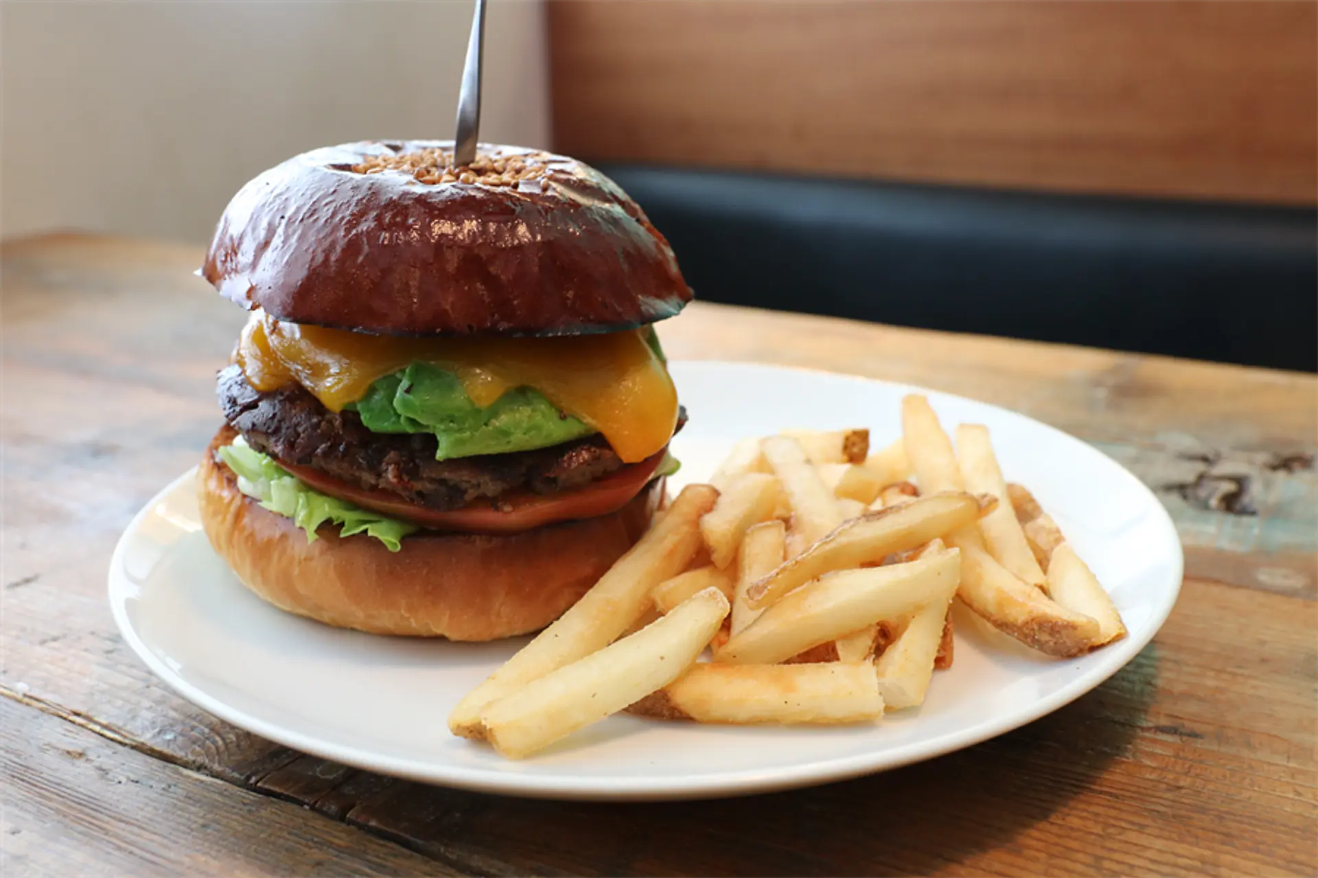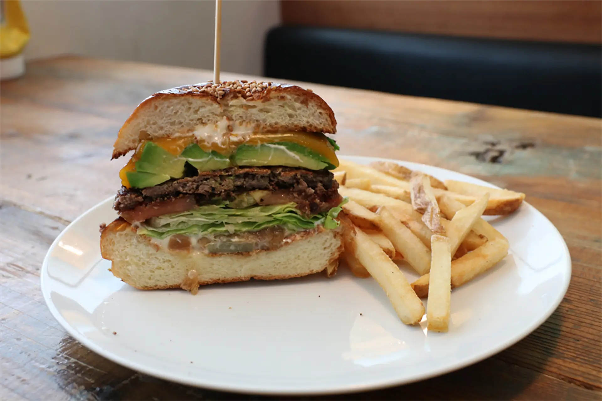 アボガド、キャベツ、トマトなど沢山の新鮮な野菜が入っているので、健康的なハンバーガーです。