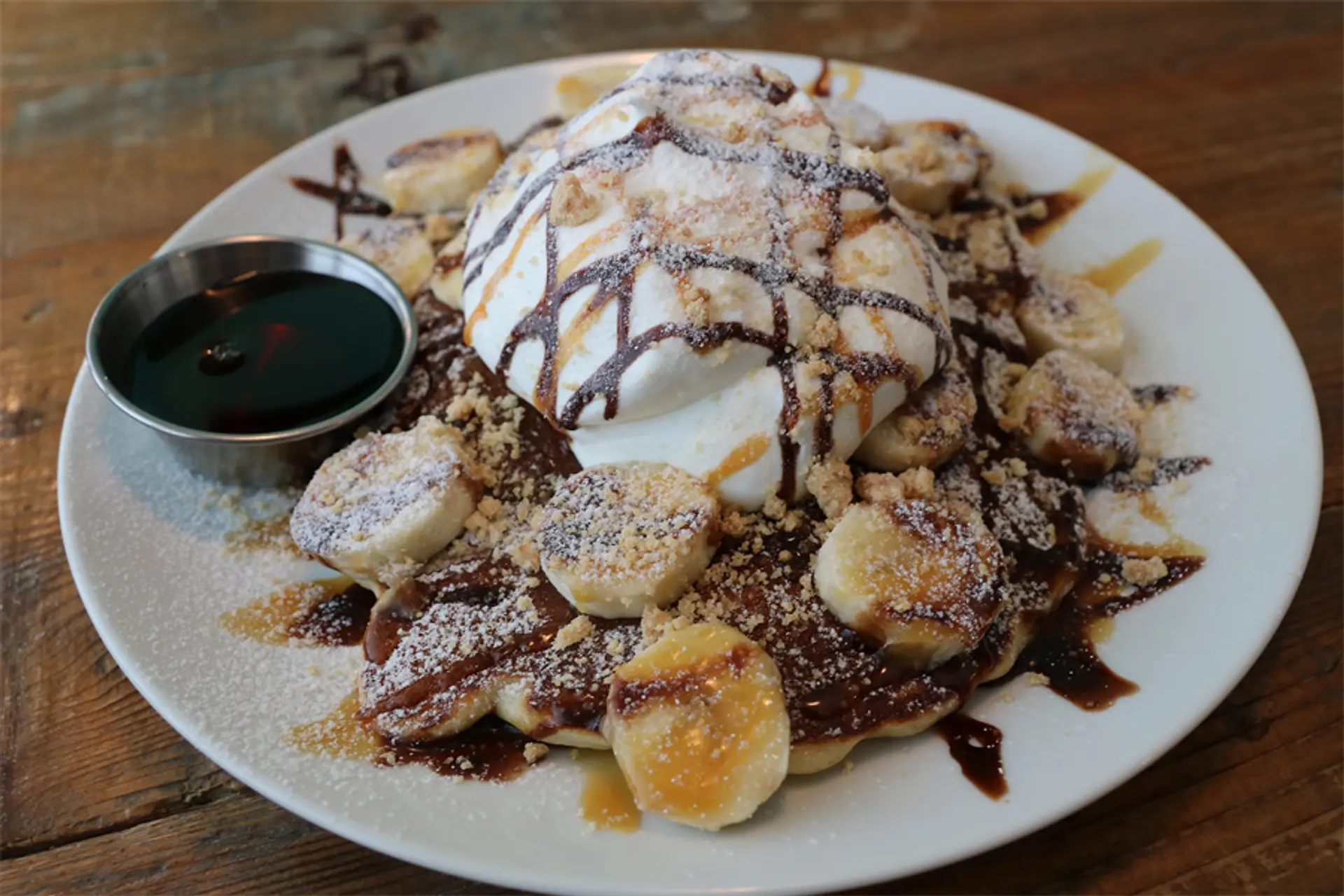 パンケーキの上にチョコソースとバナナ、たっぷりのホイップがのっており、その上からキャラメルソースをかけて頂きました。