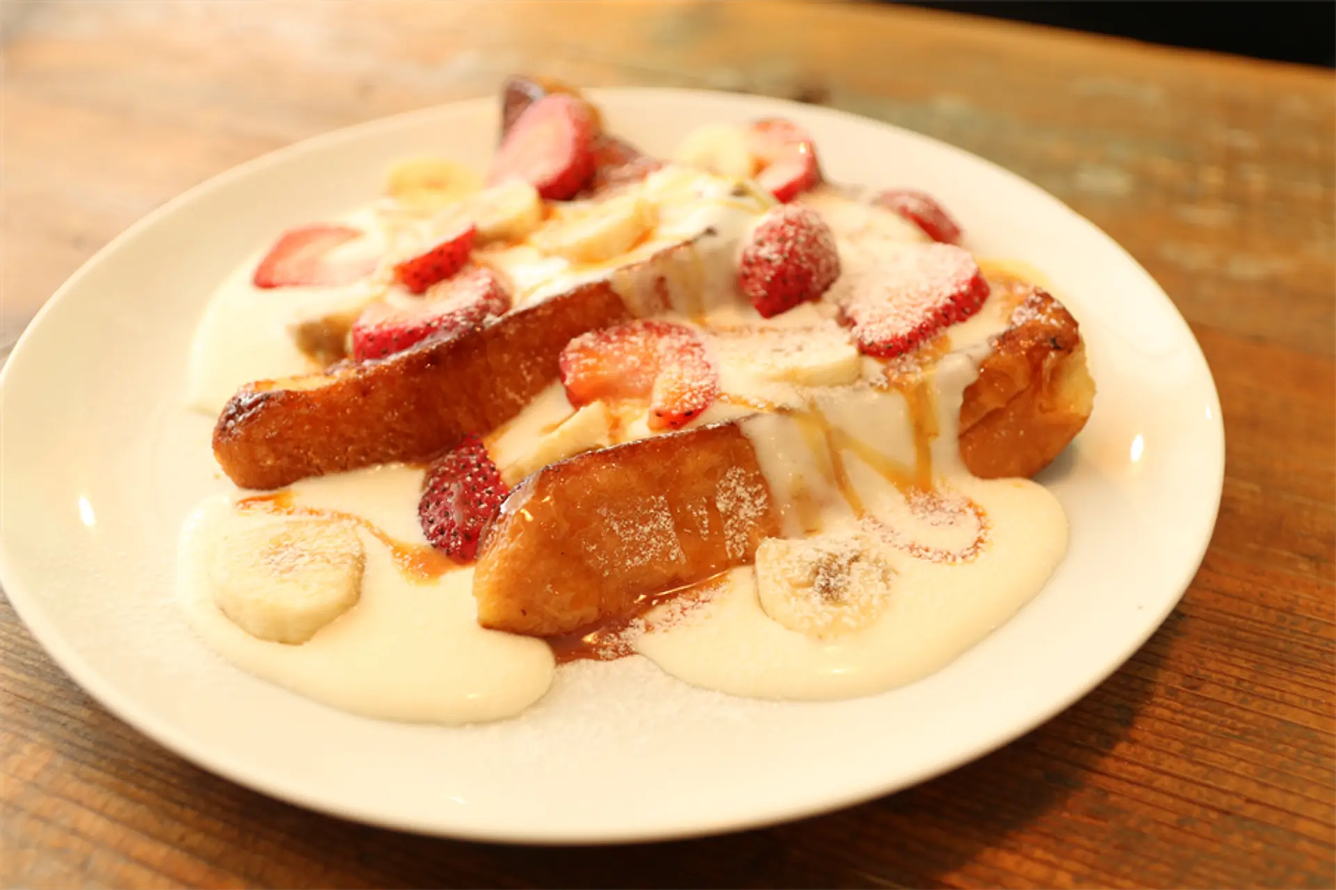 ふわふわなフレンチトーストに大人気のミルキーソースをかけ、さらにイチゴとバナナをトッピングした、まさに夢のフレンチトーストです。