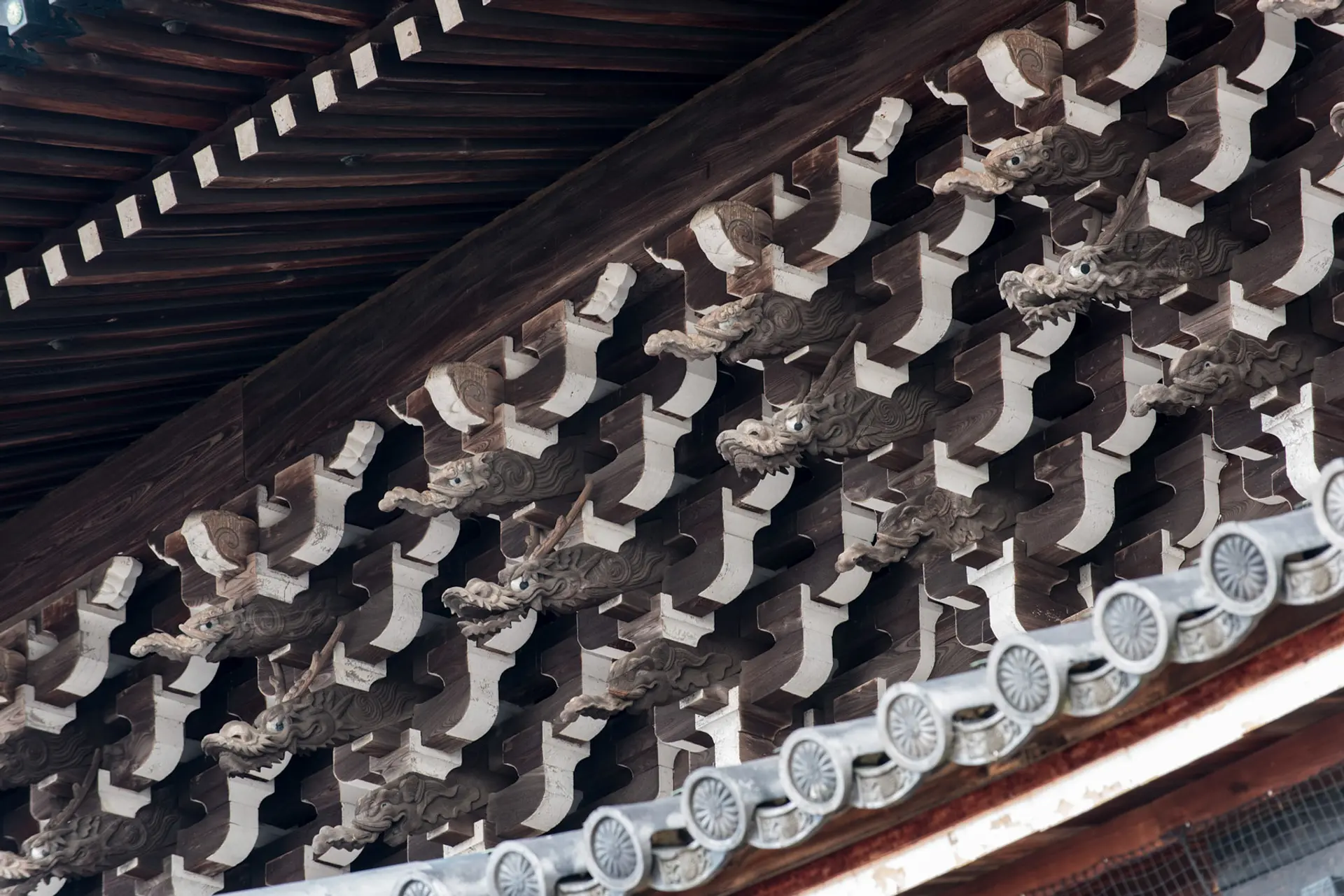 注目していただきたいのはココ。軒裏の華麗な彫刻にはびっくり!ぜひ間近でご覧ください。